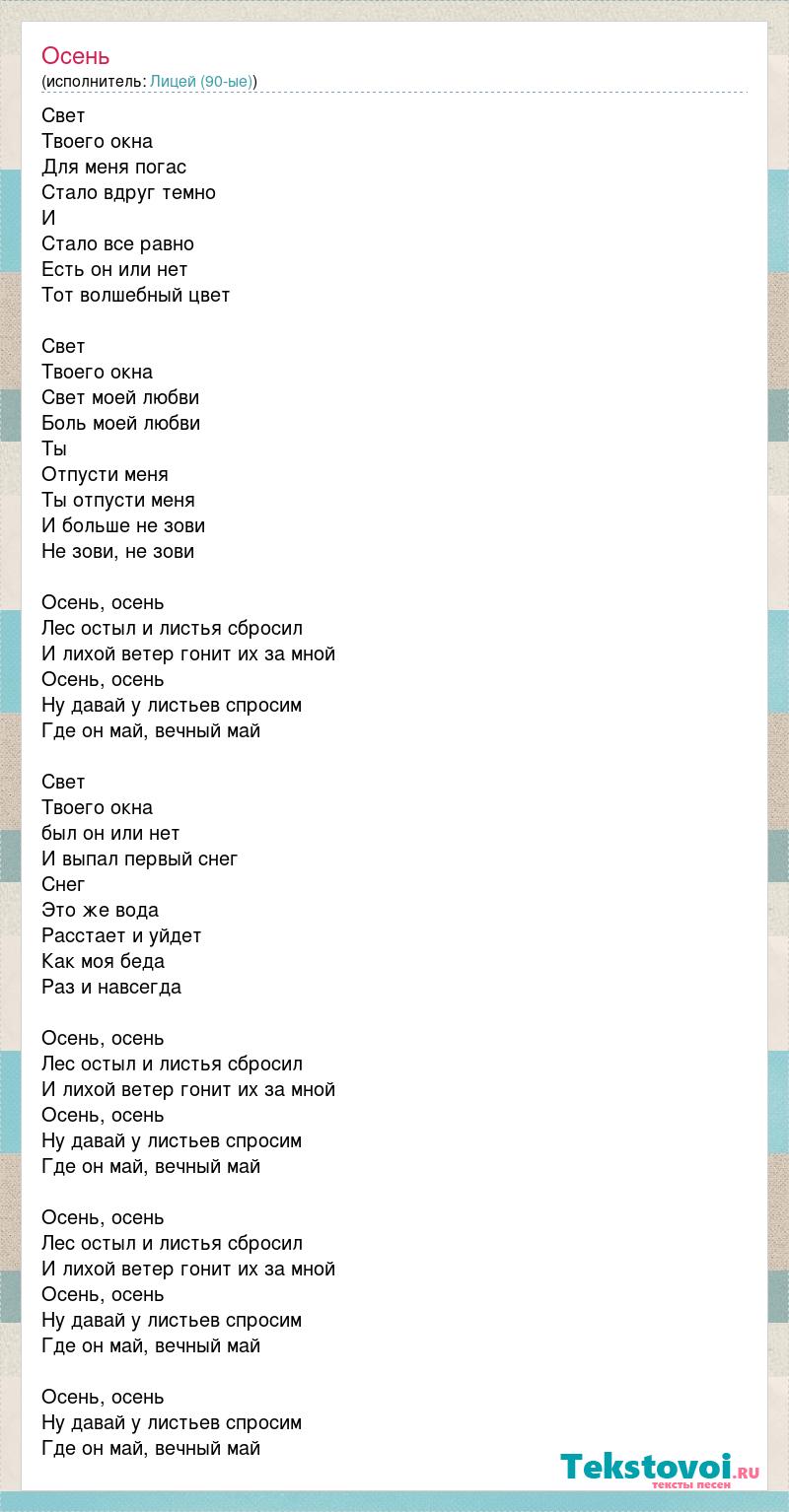 Свет Твоего окна Для меня погас Стало вдруг темно И Стало все равно Есть он или нет Тот волшебный цвет Свет Твоего окна Свет моей любви Боль моей любви Ты Отпусти меня Ты отпусти меня И больше не зови Не зови, не зови Осень, осень Лес остыл и листья сбросил И лихой ветер гонит их за мной Осень, осень Ну давай у листьев спросим Где он май, вечный май Свет Твоего окна был он или нет И выпал первый снег Снег Это же вода Расстает и уйдет Как моя беда Раз и навсегда Осень, осень Лес остыл и листья сбросил И лихой ветер гонит их за мной Осень, осень Ну давай у листьев спросим Где он май, вечный май Осень, осень Лес остыл и листья сбросил И лихой ветер гонит их за мной Осень, осень Ну давай у листьев спросим Где он май, вечный май Осень, осень Ну давай у листьев спросим Где он май, вечный май