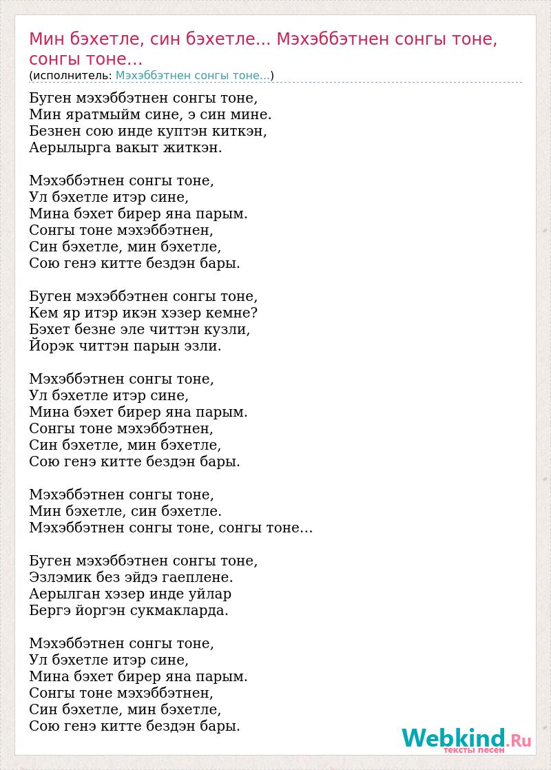 Буген мэхэббэтнен сонгы тоне, Мин яратмыйм сине, э син мине. Безнен сою инде куптэн киткэн, Аерылырга вакыт житкэн. Мэхэббэтнен сонгы тоне, Ул бэхетле итэр сине, Мина бэхет бирер яна парым. Сонгы тоне мэхэббэтнен, Син бэхетле, мин бэхетле, Сою генэ китте бездэн бары. Буген мэхэббэтнен сонгы тоне, Кем яр итэр икэн хэзер кемне? Бэхет безне эле читтэн кузли, Йорэк читтэн парын эзли. Мэхэббэтнен сонгы тоне, Ул бэхетле итэр сине, Мина бэхет бирер яна парым. Сонгы тоне мэхэббэтнен, Син бэхетле, мин бэхетле, Сою генэ китте бездэн бары. Мэхэббэтнен сонгы тоне, Мин бэхетле, син бэхетле. Мэхэббэтнен сонгы тоне, сонгы тоне… Буген мэхэббэтнен сонгы тоне, Эзлэмик без эйдэ гаеплене. Аерылган хэзер инде уйлар Бергэ йоргэн сукмакларда. Мэхэббэтнен сонгы тоне, Ул бэхетле итэр сине, Мина бэхет бирер яна парым. Сонгы тоне мэхэббэтнен, Син бэхетле, мин бэхетле, Сою генэ китте бездэн бары.