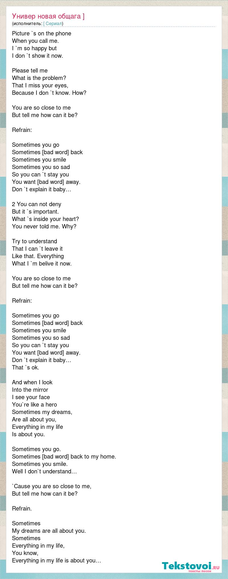 Picture `s on the phone When you call me. I `m so happy but I don `t show it now. Please tell me What is the problem? That I miss your eyes, Because I don `t know. How? You are so close to me But tell me how can it be? Refrain: Sometimes you go Sometimes you come back Sometimes you smile Sometimes you so sad So you can `t stay you You want to run away. Don `t explain it baby… 2 You can not deny But it `s important. What `s inside your heart? You never told me. Why? Try to understand That I can `t leave it Like that. Everything What I `m belive it now. You are so close to me But tell me how can it be? Refrain: Sometimes you go Sometimes you come back Sometimes you smile Sometimes you so sad So you can `t stay you You want to run away. Don `t explain it baby… That `s ok. And when I look Into the mirror I see your face You`re like a hero Sometimes my dreams, Are all about you, Everything in my life Is about you. Sometimes you go. Sometimes you come back to my home. Sometimes you smile. Well I don`t understand… `Cause you are so close to me, But tell me how can it be? Refrain. Sometimes My dreams are all about you. Sometimes Everything in my life, You know, Everything in my life is about you…