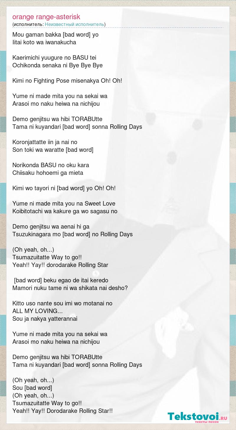 Mou gaman bakka [bad word] yo Iitai koto wa iwanakucha Kaerimichi yuugure no BASU tei Ochikonda senaka ni Bye Bye Bye Kimi no Fighting Pose misenakya Oh! Oh! Yume ni made mita you na sekai wa Arasoi mo naku heiwa na nichijou Demo genjitsu wa hibi TORABUtte Tama ni kuyandari [bad word] sonna Rolling Days Koronjattatte iin ja nai no Son toki wa waratte [bad word] Norikonda BASU no oku kara Chiisaku hohoemi ga mieta Kimi wo tayori ni [bad word] yo Oh! Oh! Yume ni made mita you na Sweet Love Koibitotachi wa kakure ga wo sagasu no Demo genjitsu wa aenai hi ga Tsuzukinagara mo [bad word] no Rolling Days (Oh yeah, oh...) Tsumazuitatte Way to go!! Yeah!! Yay!! dorodarake Rolling Star [bad word] beku egao de itai keredo Mamori nuku tame ni wa shikata nai desho? Kitto uso nante sou imi wo motanai no ALL MY LOVING... Sou ja nakya yatterannai Yume ni made mita you na sekai wa Arasoi mo naku heiwa na nichijou Demo genjitsu wa hibi TORABUtte Tama ni kuyandari [bad word] sonna Rolling Days (Oh yeah, oh...) Sou [bad word] (Oh yeah, oh...) Tsumazuitatte Way to go!! Yeah!! Yay!! Dorodarake Rolling Star!!