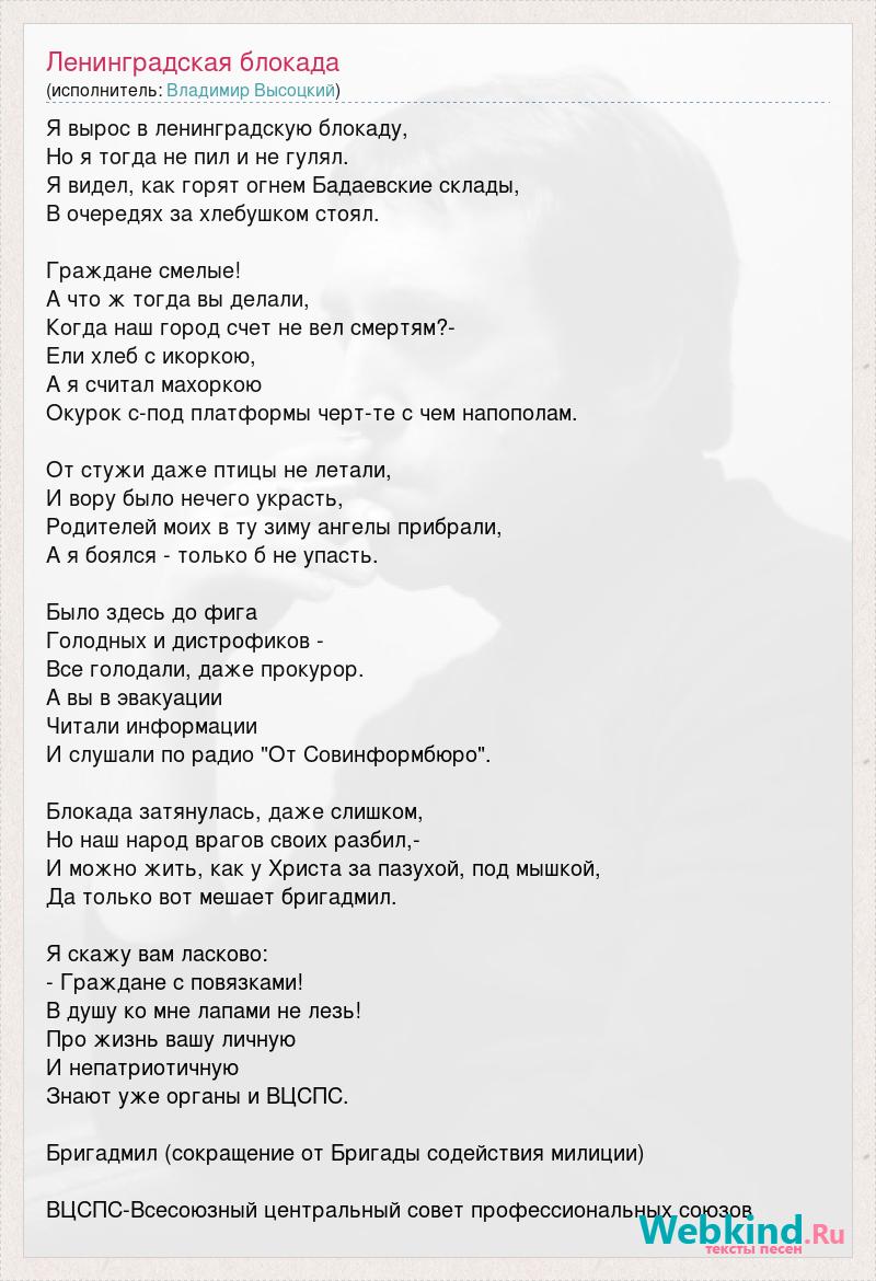 Я вырос в ленинградскую блокаду, Но я тогда не пил и не гулял. Я видел, как горят огнем Бадаевские склады, В очередях за хлебушком стоял. Граждане смелые! А что ж тогда вы делали, Когда наш город счет не вел смертям?- Ели хлеб с икоркою, А я считал махоркою Окурок с-под платформы черт-те с чем напополам. От стужи даже птицы не летали, И вору было нечего украсть, Родителей моих в ту зиму ангелы прибрали, А я боялся - только б не упасть. Было здесь до фига Голодных и дистрофиков - Все голодали, даже прокурор. А вы в эвакуации Читали информации И слушали по радио "От Совинформбюро". Блокада затянулась, даже слишком, Но наш народ врагов своих разбил,- И можно жить, как у Христа за пазухой, под мышкой, Да только вот мешает бригадмил. Я скажу вам ласково: - Граждане с повязками! В душу ко мне лапами не лезь! Про жизнь вашу личную И непатриотичную Знают уже органы и ВЦСПС. Бригадмил (сокращение от Бригады содействия милиции) ВЦСПС-Всесоюзный центральный совет профессиональных союзов