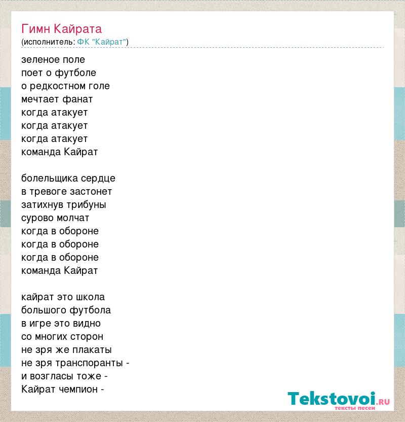 зеленое поле поет о футболе о редкостном голе мечтает фанат когда атакует когда атакует когда атакует команда Кайрат болельщика сердце в тревоге застонет затихнув трибуны сурово молчат когда в обороне когда в обороне когда в обороне команда Кайрат кайрат это школа большого футбола в игре это видно со многих сторон не зря же плакаты не зря транспоранты - и возгласы тоже - Кайрат чемпион -