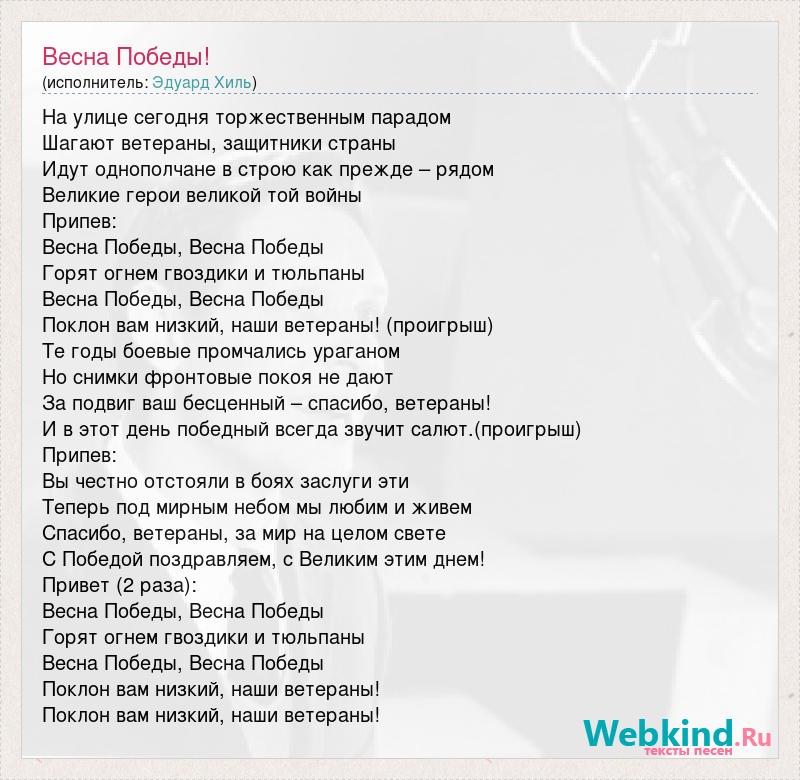 На улице сегодня торжественным парадом Шагают ветераны, защитники страны Идут однополчане в строю как прежде – рядом Великие герои великой той войны Припев: Весна Победы, Весна Победы Горят огнем гвоздики и тюльпаны Весна Победы, Весна Победы Поклон вам низкий, наши ветераны! (проигрыш) Те годы боевые промчались ураганом Но снимки фронтовые покоя не дают За подвиг ваш бесценный – спасибо, ветераны! И в этот день победный всегда звучит салют.(проигрыш) Припев: Вы честно отстояли в боях заслуги эти Теперь под мирным небом мы любим и живем Спасибо, ветераны, за мир на целом свете С Победой поздравляем, с Великим этим днем! Привет (2 раза): Весна Победы, Весна Победы Горят огнем гвоздики и тюльпаны Весна Победы, Весна Победы Поклон вам низкий, наши ветераны! Поклон вам низкий, наши ветераны!