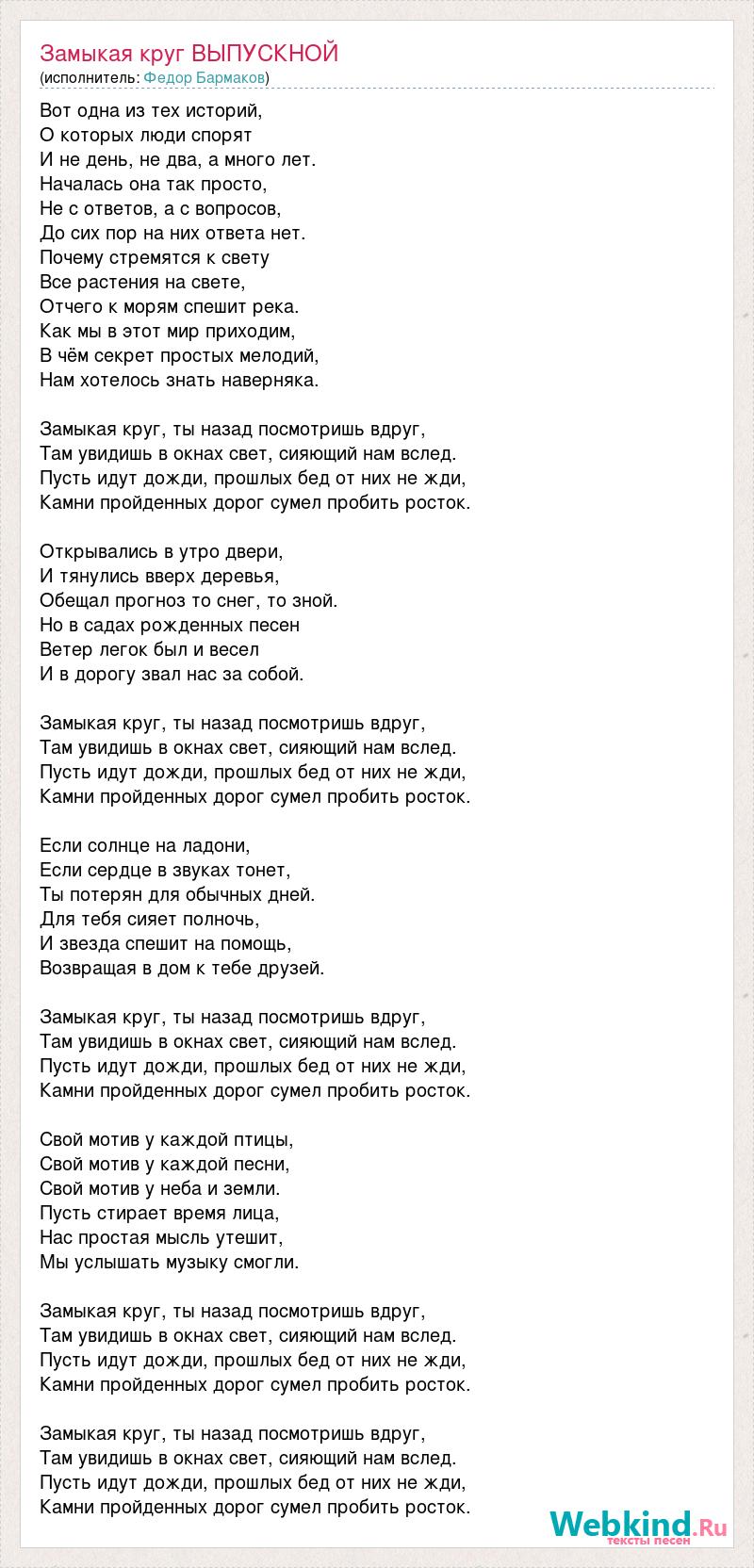 Вот одна из тех историй, О которых люди спорят И не день, не два, а много лет. Началась она так просто, Не с ответов, а с вопросов, До сих пор на них ответа нет. Почему стремятся к свету Все растения на свете, Отчего к морям спешит река. Как мы в этот мир приходим, В чём секрет простых мелодий, Нам хотелось знать наверняка. Замыкая круг, ты назад посмотришь вдруг, Там увидишь в окнах свет, сияющий нам вслед. Пусть идут дожди, прошлых бед от них не жди, Камни пройденных дорог сумел пробить росток. Открывались в утро двери, И тянулись вверх деревья, Обещал прогноз то снег, то зной. Но в садах рожденных песен Ветер легок был и весел И в дорогу звал нас за собой. Замыкая круг, ты назад посмотришь вдруг, Там увидишь в окнах свет, сияющий нам вслед. Пусть идут дожди, прошлых бед от них не жди, Камни пройденных дорог сумел пробить росток. Если солнце на ладони, Если сердце в звуках тонет, Ты потерян для обычных дней. Для тебя сияет полночь, И звезда спешит на помощь, Возвращая в дом к тебе друзей. Замыкая круг, ты назад посмотришь вдруг, Там увидишь в окнах свет, сияющий нам вслед. Пусть идут дожди, прошлых бед от них не жди, Камни пройденных дорог сумел пробить росток. Свой мотив у каждой птицы, Свой мотив у каждой песни, Свой мотив у неба и земли. Пусть стирает время лица, Нас простая мысль утешит, Мы услышать музыку смогли. Замыкая круг, ты назад посмотришь вдруг, Там увидишь в окнах свет, сияющий нам вслед. Пусть идут дожди, прошлых бед от них не жди, Камни пройденных дорог сумел пробить росток. Замыкая круг, ты назад посмотришь вдруг, Там увидишь в окнах свет, сияющий нам вслед. Пусть идут дожди, прошлых бед от них не жди, Камни пройденных дорог сумел пробить росток.