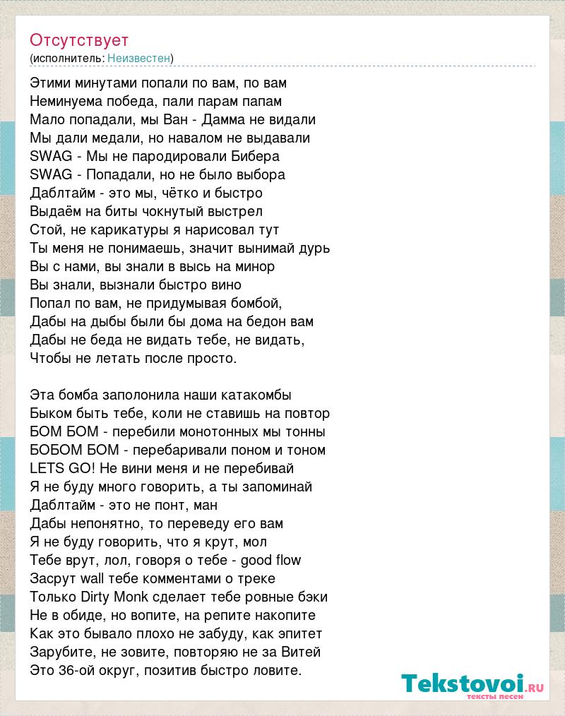 Этими минутами попали по вам, по вам Неминуема победа, пали парам папам Мало попадали, мы Ван - Дамма не видали Мы дали медали, но навалом не выдавали SWAG - Мы не пародировали Бибера SWAG - Попадали, но не было выбора Даблтайм - это мы, чётко и быстро Выдаём на биты чокнутый выстрел Стой, не карикатуры я нарисовал тут Ты меня не понимаешь, значит вынимай дурь Вы с нами, вы знали в высь на минор Вы знали, вызнали быстро вино Попал по вам, не придумывая бомбой, Дабы на дыбы были бы дома на бедон вам Дабы не беда не видать тебе, не видать, Чтобы не летать после просто. Эта бомба заполонила наши катакомбы Быком быть тебе, коли не ставишь на повтор БОМ БОМ - перебили монотонных мы тонны БОБОМ БОМ - перебаривали поном и тоном LETS GO! Не вини меня и не перебивай Я не буду много говорить, а ты запоминай Даблтайм - это не понт, ман Дабы непонятно, то переведу его вам Я не буду говорить, что я крут, мол Тебе врут, лол, говоря о тебе - good flow Засрут wall тебе комментами о треке Только Dirty Monk сделает тебе ровные бэки Не в обиде, но вопите, на репите накопите Как это бывало плохо не забуду, как эпитет Зарубите, не зовите, повторяю не за Витей Это 36-ой округ, позитив быстро ловите.
