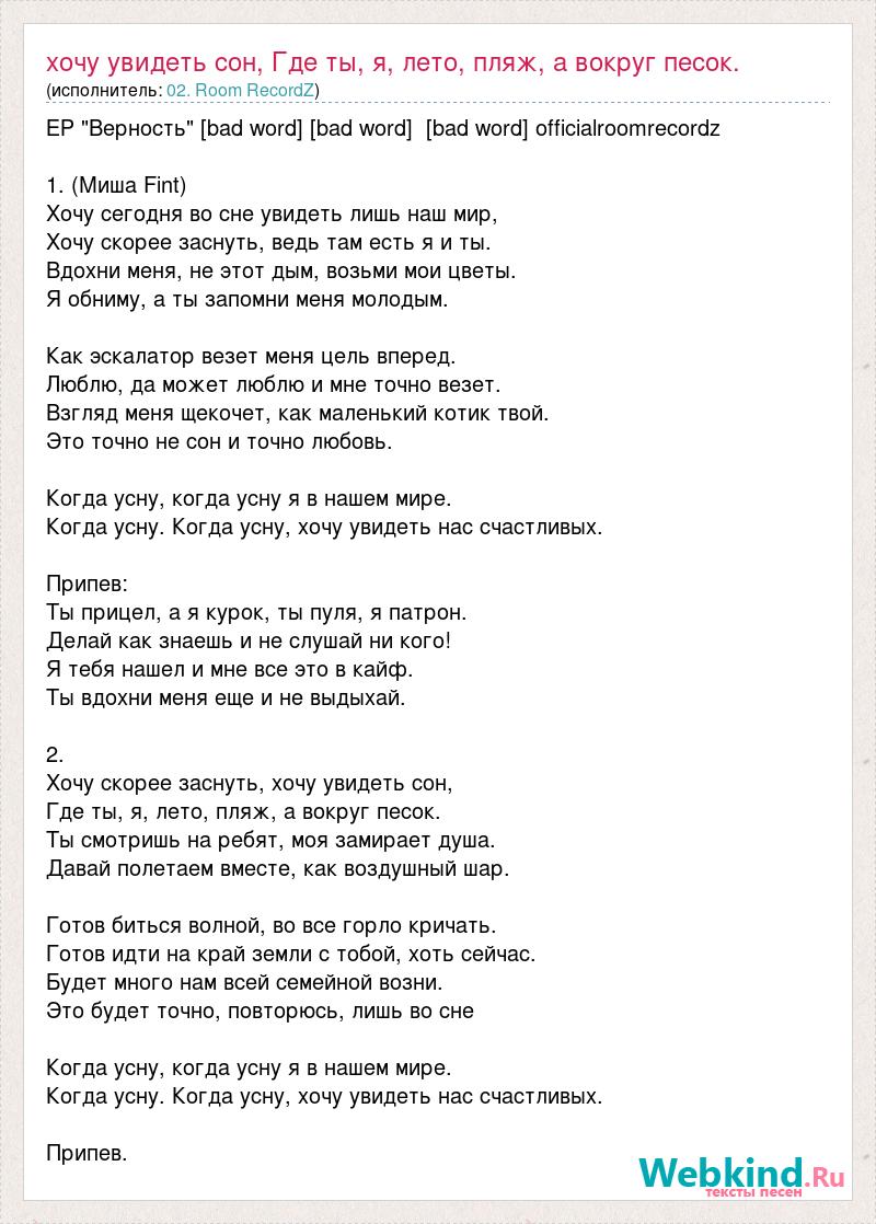 ЕР "Верность" [bad word] [bad word] [bad word] officialroomrecordz 1. (Миша Fint) Хочу сегодня во сне увидеть лишь наш мир, Хочу скорее заснуть, ведь там есть я и ты. Вдохни меня, не этот дым, возьми мои цветы. Я обниму, а ты запомни меня молодым. Как эскалатор везет меня цель вперед. Люблю, да может люблю и мне точно везет. Взгляд меня щекочет, как маленький котик твой. Это точно не сон и точно любовь. Когда усну, когда усну я в нашем мире. Когда усну. Когда усну, хочу увидеть нас счастливых. Припев: Ты прицел, а я курок, ты пуля, я патрон. Делай как знаешь и не слушай ни кого! Я тебя нашел и мне все это в кайф. Ты вдохни меня еще и не выдыхай. 2. Хочу скорее заснуть, хочу увидеть сон, Где ты, я, лето, пляж, а вокруг песок. Ты смотришь на ребят, моя замирает душа. Давай полетаем вместе, как воздушный шар. Готов биться волной, во все горло кричать. Готов идти на край земли с тобой, хоть сейчас. Будет много нам всей семейной возни. Это будет точно, повторюсь, лишь во сне Когда усну, когда усну я в нашем мире. Когда усну. Когда усну, хочу увидеть нас счастливых. Припев.