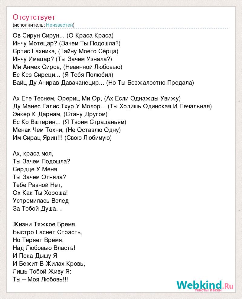 Ов Сирун Сирун... (О Краса Краса) Инчу Мотецар? (Зачем Ты Подошла?) Сртис Гахникэ, (Тайну Моего Серца) Инчу Имацар? (Ты Зачем Узнала?) Ми Анмех Сиров, (Невинной Любовью) Ес Кез Сиреци... (Я Тебя Полюбил) Байц Ду Анирав Давачанецир... (Но Ты Безжалостно Предала) Ах Ете Теснем, Орериц Ми Ор, (Ах Если Однажды Увижу) Ду Манес Галис Тхур У Молор... (Ты Ходишь Одинокая И Печальная) Энкер К Дарнам, (Стану Другом) Ес Ко Вштерин... (Я Твоим Страданьям) Менак Чем Тохни, (Не Оставлю Одну) Им Сирац Ярин!!! (Свою Любимую) Ах, краса моя, Ты Зачем Подошла? Сердце У Меня Ты Зачем Отняла? Тебе Равной Нет, Ох Как Ты Хороша! Устремилась Вслед За Тобой Душа… Жизни Тяжкое Бремя, Быстро Гаснет Страсть, Но Теряет Время, Над Любовью Власть! И Пока Дышу Я И Бежит В Жилах Кровь, Лишь Тобой Живу Я: Ты – Моя Любовь!!!