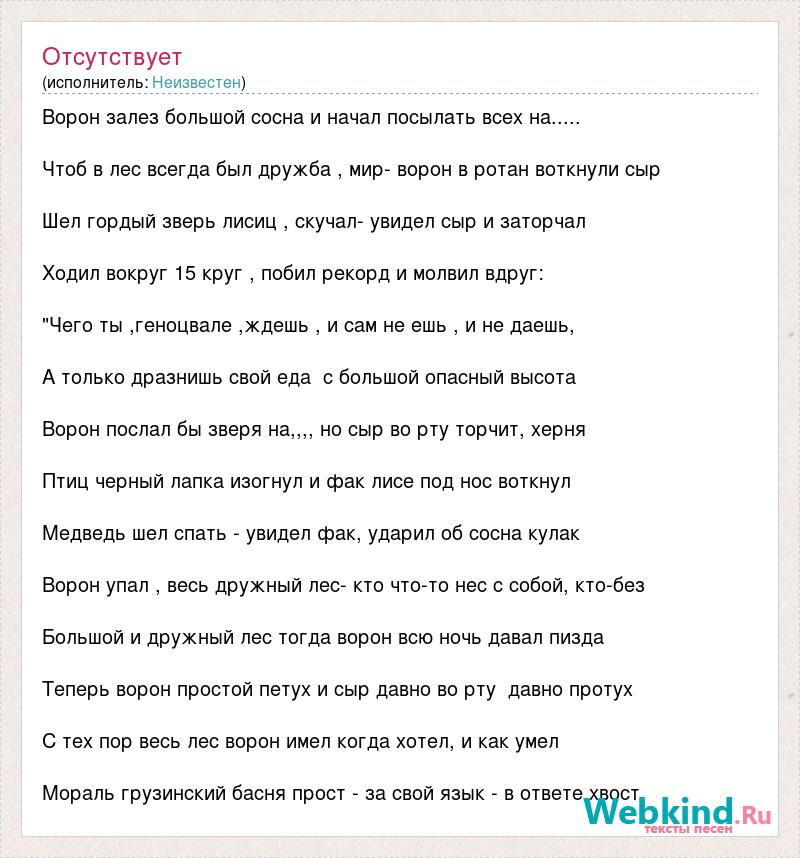 Ворон залез большой сосна и начал посылать всех на..... Чтоб в лес всегда был дружба , мир- ворон в ротан воткнули сыр Шел гордый зверь лисиц , скучал- увидел сыр и заторчал Ходил вокруг 15 круг , побил рекорд и молвил вдруг: "Чего ты ,геноцвале ,ждешь , и сам не ешь , и не даешь, А только дразнишь свой еда с большой опасный высота Ворон послал бы зверя на,,,, но сыр во рту торчит, херня Птиц черный лапка изогнул и фак лисе под нос воткнул Медведь шел спать - увидел фак, ударил об сосна кулак Ворон упал , весь дружный лес- кто что-то нес с собой, кто-без Большой и дружный лес тогда ворон всю ночь давал пизда Теперь ворон простой петух и сыр давно во рту давно протух С тех пор весь лес ворон имел когда хотел, и как умел Мораль грузинский басня прост - за свой язык - в ответе хвост