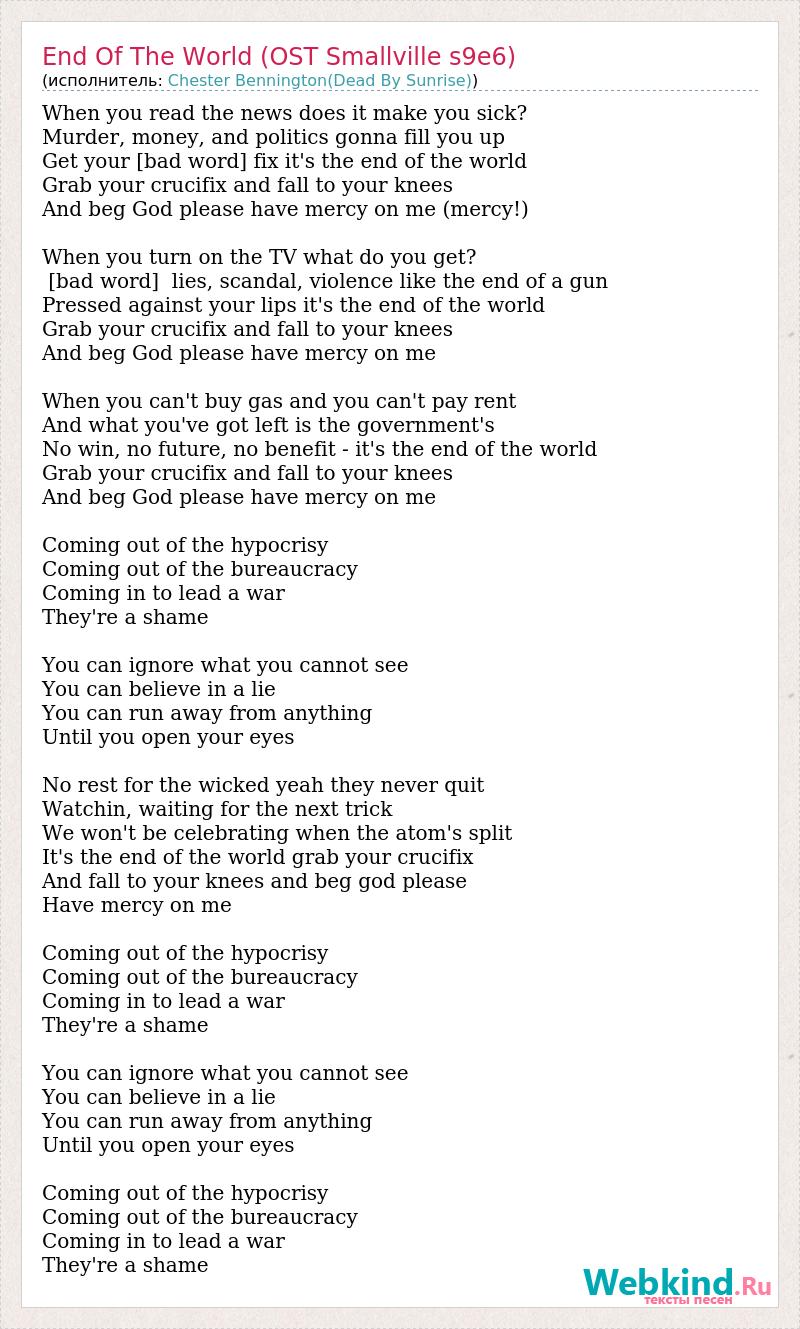 When you read the news does it make you sick? Murder, money, and politics gonna fill you up Get your [bad word] fix it's the end of the world Grab your crucifix and fall to your knees And beg God please have mercy on me (mercy!) When you turn on the TV what do you get? [bad word] lies, scandal, violence like the end of a gun Pressed against your lips it's the end of the world Grab your crucifix and fall to your knees And beg God please have mercy on me When you can't buy gas and you can't pay rent And what you've got left is the government's No win, no future, no benefit - it's the end of the world Grab your crucifix and fall to your knees And beg God please have mercy on me Coming out of the hypocrisy Coming out of the bureaucracy Coming in to lead a war They're a shame You can ignore what you cannot see You can believe in a lie You can run away from anything Until you open your eyes No rest for the wicked yeah they never quit Watchin, waiting for the next trick We won't be celebrating when the atom's split It's the end of the world grab your crucifix And fall to your knees and beg god please Have mercy on me Coming out of the hypocrisy Coming out of the bureaucracy Coming in to lead a war They're a shame You can ignore what you cannot see You can believe in a lie You can run away from anything Until you open your eyes Coming out of the hypocrisy Coming out of the bureaucracy Coming in to lead a war They're a shame