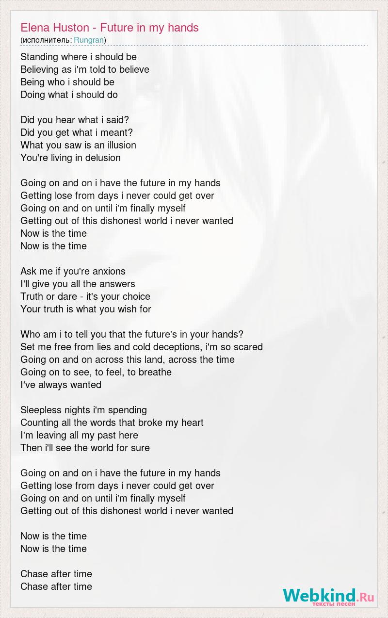 Standing where i should be Believing as i'm told to believe Being who i should be Doing what i should do Did you hear what i said? Did you get what i meant? What you saw is an illusion You're living in delusion Going on and on i have the future in my hands Getting lose from days i never could get over Going on and on until i'm finally myself Getting out of this dishonest world i never wanted Now is the time Now is the time Ask me if you're anxions I'll give you all the answers Truth or dare - it's your choice Your truth is what you wish for Who am i to tell you that the future's in your hands? Set me free from lies and cold deceptions, i'm so scared Going on and on across this land, across the time Going on to see, to feel, to breathe I've always wanted Sleepless nights i'm spending Counting all the words that broke my heart I'm leaving all my past here Then i'll see the world for sure Going on and on i have the future in my hands Getting lose from days i never could get over Going on and on until i'm finally myself Getting out of this dishonest world i never wanted Now is the time Now is the time Chase after time Chase after time