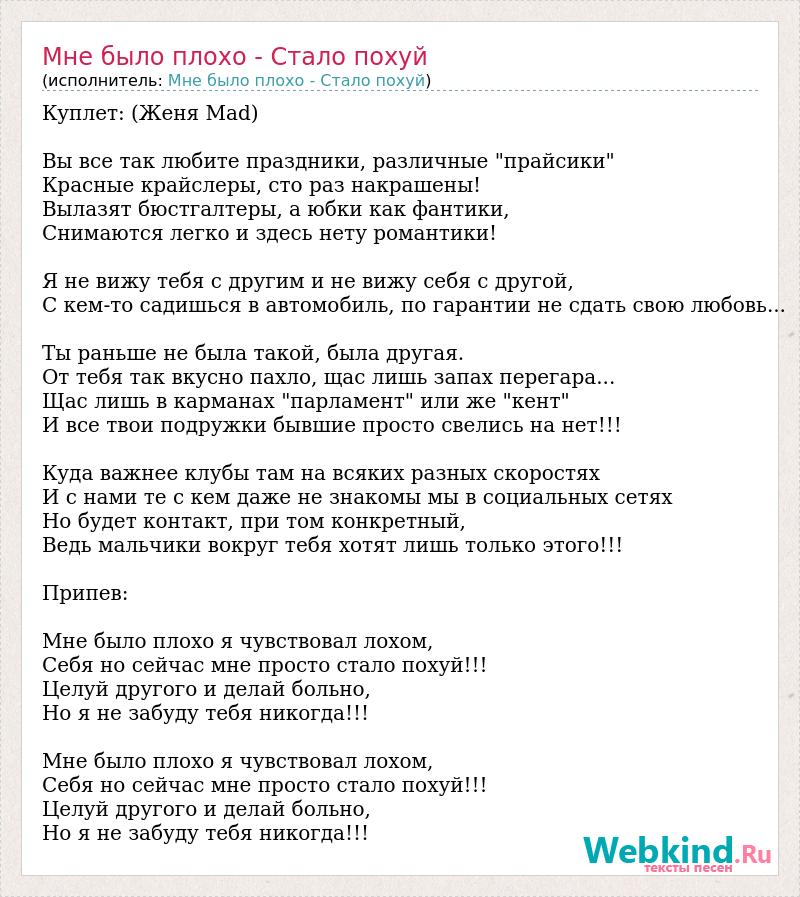 Куплет: (Женя Mad) Вы все так любите праздники, различные "прайсики" Красные крайслеры, сто раз накрашены! Вылазят бюстгалтеры, а юбки как фантики, Снимаются легко и здесь нету романтики! Я не вижу тебя с другим и не вижу себя с другой, С кем-то садишься в автомобиль, по гарантии не сдать свою любовь... Ты раньше не была такой, была другая. От тебя так вкусно пахло, щас лишь запах перегара... Щас лишь в карманах "парламент" или же "кент" И все твои подружки бывшие просто свелись на нет!!! Куда важнее клубы там на всяких разных скоростях И с нами те с кем даже не знакомы мы в социальных сетях Но будет контакт, при том конкретный, Ведь мальчики вокруг тебя хотят лишь только этого!!! Припев: Мне было плохо я чувствовал лохом, Себя но сейчас мне просто стало похуй!!! Целуй другого и делай больно, Но я не забуду тебя никогда!!! Мне было плохо я чувствовал лохом, Себя но сейчас мне просто стало похуй!!! Целуй другого и делай больно, Но я не забуду тебя никогда!!!