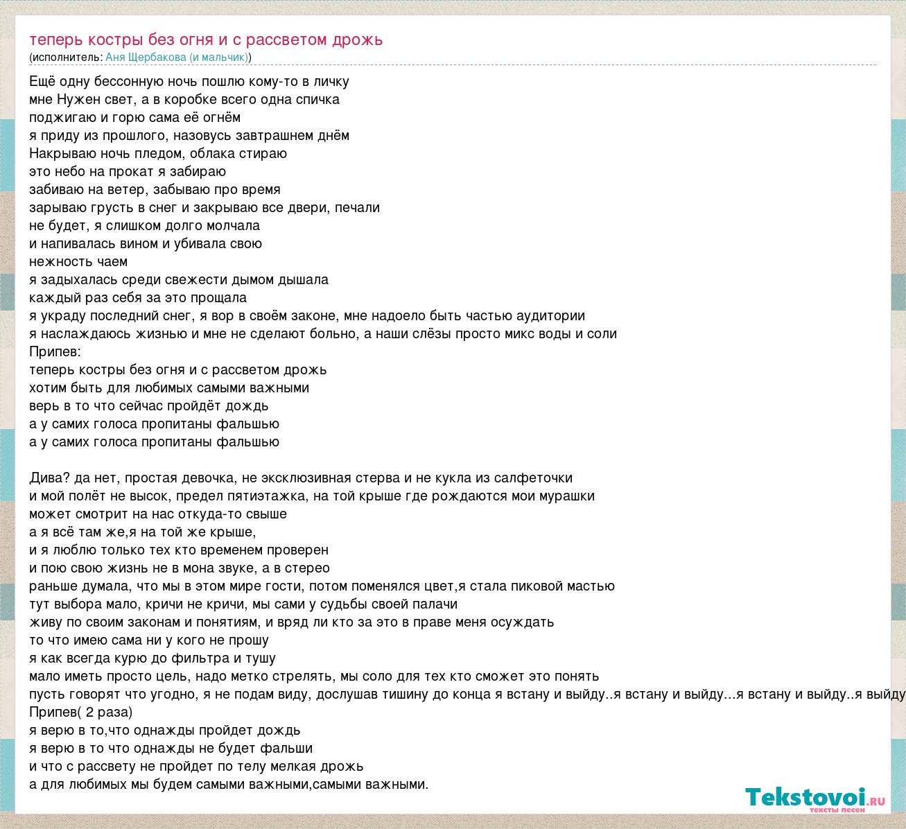Ещё одну бессонную ночь пошлю кому-то в личку мне Нужен свет, а в коробке всего одна спичка поджигаю и горю сама её огнём я приду из прошлого, назовусь завтрашнем днём Накрываю ночь пледом, облака стираю это небо на прокат я забираю забиваю на ветер, забываю про время зарываю грусть в снег и закрываю все двери, печали не будет, я слишком долго молчала и напивалась вином и убивала свою нежность чаем я задыхалась среди свежести дымом дышала каждый раз себя за это прощала я украду последний снег, я вор в своём законе, мне надоело быть частью аудитории я наслаждаюсь жизнью и мне не сделают больно, а наши слёзы просто микс воды и соли Припев: теперь костры без огня и с рассветом дрожь хотим быть для любимых самыми важными верь в то что сейчас пройдёт дождь а у самих голоса пропитаны фальшью а у самих голоса пропитаны фальшью Дива? да нет, простая девочка, не эксклюзивная стерва и не кукла из салфеточки и мой полёт не высок, предел пятиэтажка, на той крыше где рождаются мои мурашки может смотрит на нас откуда-то свыше а я всё там же,я на той же крыше, и я люблю только тех кто временем проверен и пою свою жизнь не в мона звуке, а в стерео раньше думала, что мы в этом мире гости, потом поменялся цвет,я стала пиковой мастью тут выбора мало, кричи не кричи, мы сами у судьбы своей палачи живу по своим законам и понятиям, и вряд ли кто за это в праве меня осуждать то что имею сама ни у кого не прошу я как всегда курю до фильтра и тушу мало иметь просто цель, надо метко стрелять, мы соло для тех кто сможет это понять пусть говорят что угодно, я не подам виду, дослушав тишину до конца я встану и выйду..я встану и выйду...я встану и выйду..я выйду Припев( 2 раза) я верю в то,что однажды пройдет дождь я верю в то что однажды не будет фальши и что с рассвету не пройдет по телу мелкая дрожь а для любимых мы будем самыми важными,самыми важными.