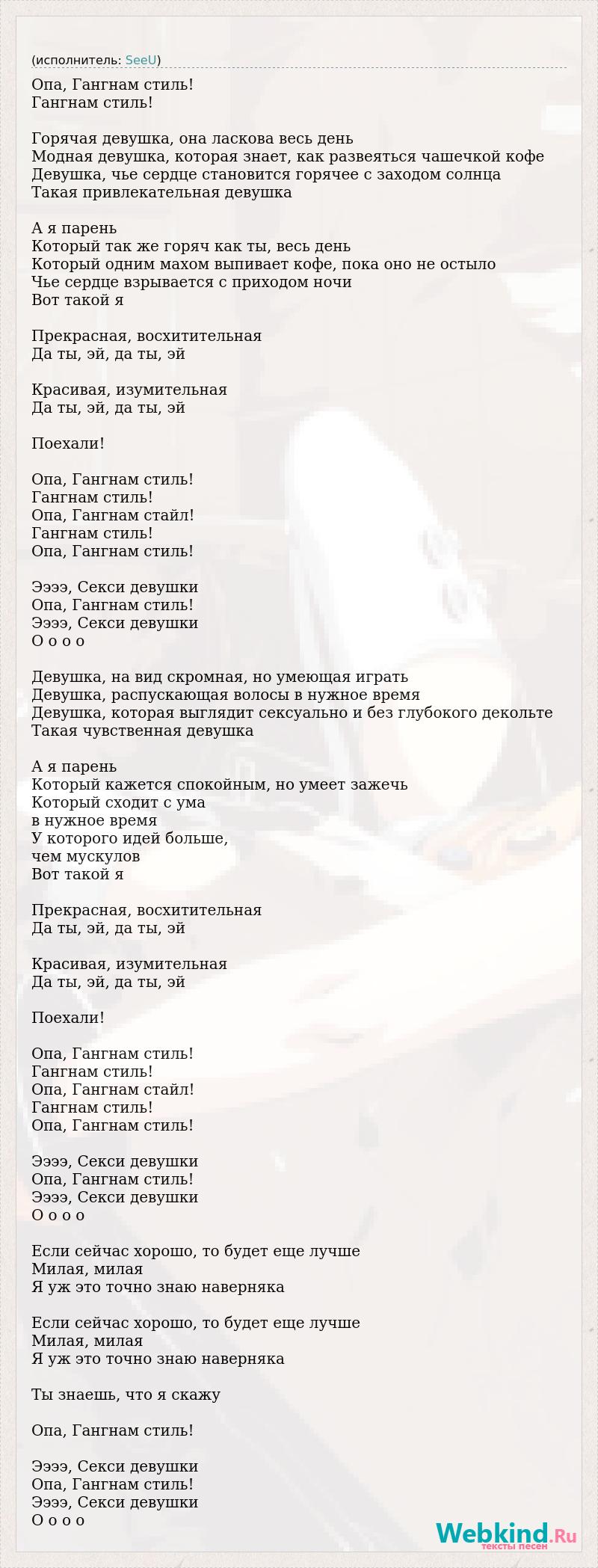 Опа, Гангнам стиль! Гангнам стиль! Горячая девушка, она ласкова весь день Модная девушка, которая знает, как развеяться чашечкой кофе Девушка, чье сердце становится горячее с заходом солнца Такая привлекательная девушка А я парень Который так же горяч как ты, весь день Который одним махом выпивает кофе, пока оно не остыло Чье сердце взрывается с приходом ночи Вот такой я Прекрасная, восхитительная Да ты, эй, да ты, эй Красивая, изумительная Да ты, эй, да ты, эй Поехали! Опа, Гангнам стиль! Гангнам стиль! Опа, Гангнам стайл! Гангнам стиль! Опа, Гангнам стиль! Ээээ, Секси девушки Опа, Гангнам стиль! Ээээ, Секси девушки О о о о Девушка, на вид скромная, но умеющая играть Девушка, распускающая волосы в нужное время Девушка, которая выглядит сексуально и без глубокого декольте Такая чувственная девушка А я парень Который кажется спокойным, но умеет зажечь Который сходит с ума в нужное время У которого идей больше, чем мускулов Вот такой я Прекрасная, восхитительная Да ты, эй, да ты, эй Красивая, изумительная Да ты, эй, да ты, эй Поехали! Опа, Гангнам стиль! Гангнам стиль! Опа, Гангнам стайл! Гангнам стиль! Опа, Гангнам стиль! Ээээ, Секси девушки Опа, Гангнам стиль! Ээээ, Секси девушки О о о о Если сейчас хорошо, то будет еще лучше Милая, милая Я уж это точно знаю наверняка Если сейчас хорошо, то будет еще лучше Милая, милая Я уж это точно знаю наверняка Ты знаешь, что я скажу Опа, Гангнам стиль! Ээээ, Секси девушки Опа, Гангнам стиль! Ээээ, Секси девушки О о о о