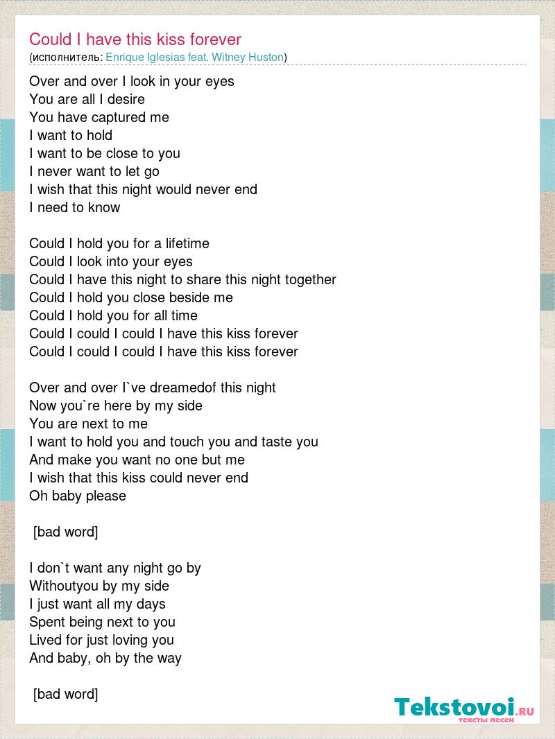 Over and over I look in your eyes You are all I desire You have captured me I want to hold I want to be close to you I never want to let go I wish that this night would never end I need to know Could I hold you for a lifetime Could I look into your eyes Could I have this night to share this night together Could I hold you close beside me Could I hold you for all time Could I could I could I have this kiss forever Could I could I could I have this kiss forever Over and over I`ve dreamedof this night Now you`re here by my side You are next to me I want to hold you and touch you and taste you And make you want no one but me I wish that this kiss could never end Oh baby please [bad word] I don`t want any night go by Withoutyou by my side I just want all my days Spent being next to you Lived for just loving you And baby, oh by the way [bad word]