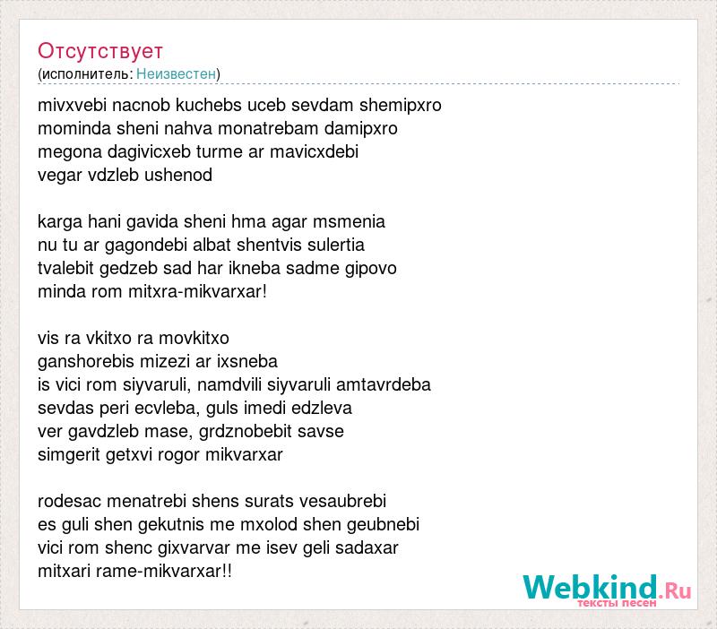 mivxvebi nacnob kuchebs uceb sevdam shemipxro mominda sheni nahva monatrebam damipxro megona dagivicxeb turme ar mavicxdebi vegar vdzleb ushenod karga hani gavida sheni hma agar msmenia nu tu ar gagondebi albat shentvis sulertia tvalebit gedzeb sad har ikneba sadme gipovo minda rom mitxra-mikvarxar! vis ra vkitxo ra movkitxo ganshorebis mizezi ar ixsneba is vici rom siyvaruli, namdvili siyvaruli amtavrdeba sevdas peri ecvleba, guls imedi edzleva ver gavdzleb mase, grdznobebit savse simgerit getxvi rogor mikvarxar rodesac menatrebi shens surats vesaubrebi es guli shen gekutnis me mxolod shen geubnebi vici rom shenc gixvarvar me isev geli sadaxar mitxari rame-mikvarxar!!