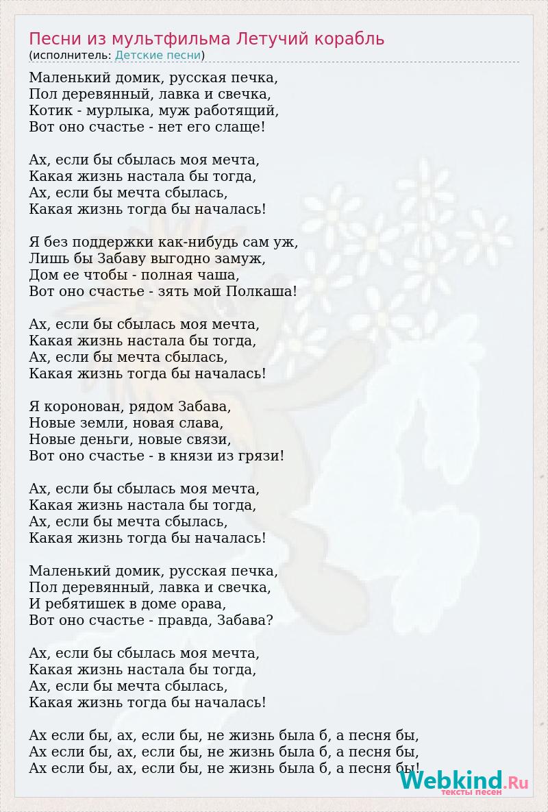 Маленький домик, русская печка, Пол деревянный, лавка и свечка, Котик - мурлыка, муж работящий, Вот оно счастье - нет его слаще! Ах, если бы сбылась моя мечта, Какая жизнь настала бы тогда, Ах, если бы мечта сбылась, Какая жизнь тогда бы началась! Я без поддержки как-нибудь сам уж, Лишь бы Забаву выгодно замуж, Дом ее чтобы - полная чаша, Вот оно счастье - зять мой Полкаша! Ах, если бы сбылась моя мечта, Какая жизнь настала бы тогда, Ах, если бы мечта сбылась, Какая жизнь тогда бы началась! Я коронован, рядом Забава, Новые земли, новая слава, Новые деньги, новые связи, Вот оно счастье - в князи из грязи! Ах, если бы сбылась моя мечта, Какая жизнь настала бы тогда, Ах, если бы мечта сбылась, Какая жизнь тогда бы началась! Маленький домик, русская печка, Пол деревянный, лавка и свечка, И ребятишек в доме орава, Вот оно счастье - правда, Забава? Ах, если бы сбылась моя мечта, Какая жизнь настала бы тогда, Ах, если бы мечта сбылась, Какая жизнь тогда бы началась! Ах если бы, ах, если бы, не жизнь была б, а песня бы, Ах если бы, ах, если бы, не жизнь была б, а песня бы, Ах если бы, ах, если бы, не жизнь была б, а песня бы!