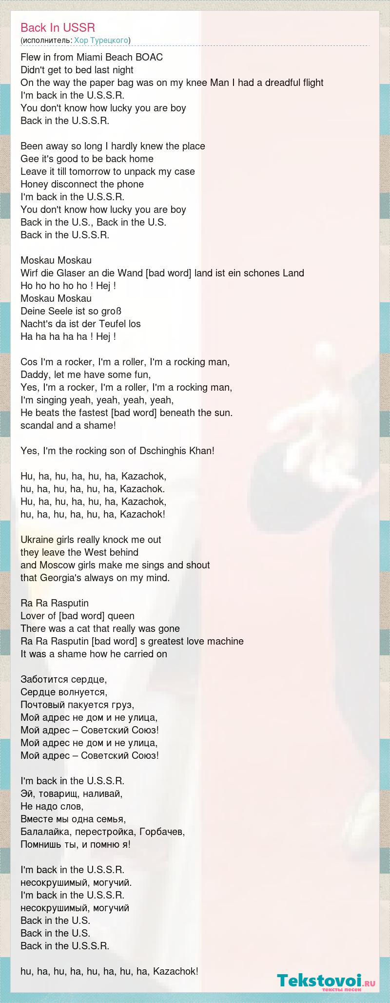 Flew in from Miami Beach BOAC Didn't get to bed last night On the way the paper bag was on my knee Man I had a dreadful flight I'm back in the U.S.S.R. You don't know how lucky you are boy Back in the U.S.S.R. Been away so long I hardly knew the place Gee it's good to be back home Leave it till tomorrow to unpack my case Honey disconnect the phone I'm back in the U.S.S.R. You don't know how lucky you are boy Back in the U.S., Back in the U.S. Back in the U.S.S.R. Moskau Moskau Wirf die Glaser an die Wand Rußland ist ein schones Land Ho ho ho ho ho ! Hej ! Moskau Moskau Deine Seele ist so groß Nacht's da ist der Teufel los Ha ha ha ha ha ! Hej ! Cos I'm a rocker, I'm a roller, I'm a rocking man, Daddy, let me have some fun, Yes, I'm a rocker, I'm a roller, I'm a rocking man, I'm singing yeah, yeah, yeah, yeah, He beats the fastest drum beneath the sun. scandal and a shame! Yes, I'm the rocking son of Dschinghis Khan! Hu, ha, hu, ha, hu, ha, Kazachok, hu, ha, hu, ha, hu, ha, Kazachok. Hu, ha, hu, ha, hu, ha, Kazachok, hu, ha, hu, ha, hu, ha, Kazachok! Ukraine girls really knock me out they leave the West behind and Moscow girls make me sings and shout that Georgia's always on my mind. Ra Ra Rasputin Lover of the Russian queen There was a cat that really was gone Ra Ra Rasputin Russia's greatest love machine It was a shame how he carried on Заботится сердце, Сердце волнуется, Почтовый пакуется груз, Мой адрес не дом и не улица, Мой адрес – Советский Союз! Мой адрес не дом и не улица, Мой адрес – Советский Союз! I'm back in the U.S.S.R. Эй, товарищ, наливай, Не надо слов, Вместе мы одна семья, Балалайка, перестройка, Горбачев, Помнишь ты, и помню я! I'm back in the U.S.S.R. несокрушимый, могучий. I'm back in the U.S.S.R. несокрушимый, могучий Back in the U.S. Back in the U.S. Back in the U.S.S.R. hu, ha, hu, ha, hu, ha, hu, ha, Kazachok!