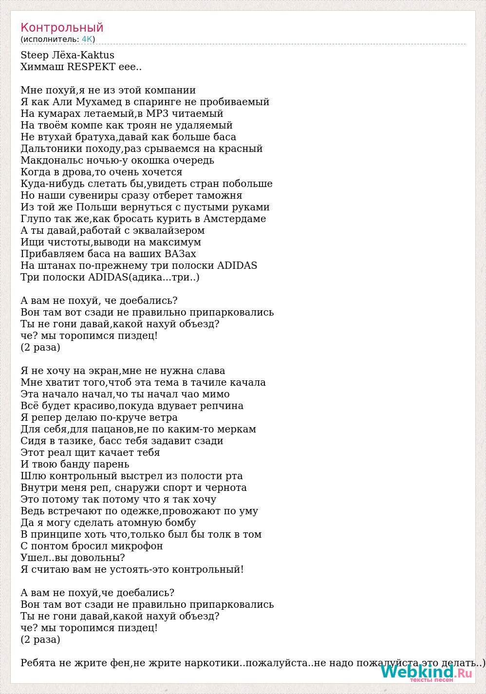 Steep Лёха-Kaktus Химмаш RESPEKT еее.. Мне похуй,я не из этой компании Я как Али Мухамед в спаринге не пробиваемый На кумарах летаемый,в MP3 читаемый На твоём компе как троян не удаляемый Не втухай братуха,давай как больше баса Дальтоники походу,раз срываемся на красный Макдональс ночью-у окошка очередь Когда в дрова,то очень хочется Куда-нибудь слетать бы,увидеть стран побольше Но наши сувениры сразу отберет таможня Из той же Польши вернуться с пустыми руками Глупо так же,как бросать курить в Амстердаме А ты давай,работай с эквалайзером Ищи чистоты,выводи на максимум Прибавляем баса на ваших ВАЗах На штанах по-прежнему три полоски ADIDAS Три полоски ADIDAS(адика...три..) А вам не похуй, че доебались? Вон там вот сзади не правильно припарковались Ты не гони давай,какой нахуй объезд? че? мы торопимся пиздец! (2 раза) Я не хочу на экран,мне не нужна слава Мне хватит того,чтоб эта тема в тачиле качала Эта начало начал,чо ты начал чао мимо Всё будет красиво,покуда вдувает репчина Я репер делаю по-круче ветра Для себя,для пацанов,не по каким-то меркам Сидя в тазике, басс тебя задавит сзади Этот реал щит качает тебя И твою банду парень Шлю контрольный выстрел из полости рта Внутри меня реп, снаружи спорт и чернота Это потому так потому что я так хочу Ведь встречают по одежке,провожают по уму Да я могу сделать атомную бомбу В принципе хоть что,только был бы толк в том С понтом бросил микрофон Ушел..вы довольны? Я считаю вам не устоять-это контрольный! А вам не похуй,че доебались? Вон там вот сзади не правильно припарковались Ты не гони давай,какой нахуй объезд? че? мы торопимся пиздец! (2 раза) Ребята не жрите фен,не жрите наркотики..пожалуйста..не надо пожалуйста это делать..)