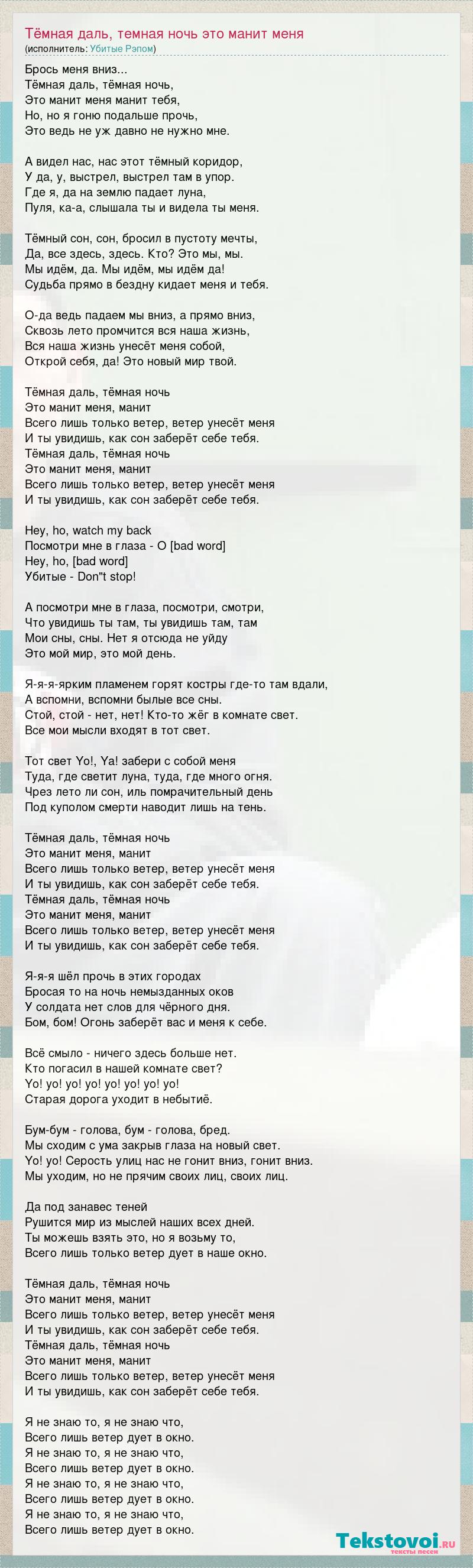 Брось меня вниз... Тёмная даль, тёмная ночь, Это манит меня манит тебя, Но, но я гоню подальше прочь, Это ведь не уж давно не нужно мне. А видел нас, нас этот тёмный коридор, У да, у, выстрел, выстрел там в упор. Где я, да на землю падает луна, Пуля, ка-а, слышала ты и видела ты меня. Тёмный сон, сон, бросил в пустоту мечты, Да, все здесь, здесь. Кто? Это мы, мы. Мы идём, да. Мы идём, мы идём да! Судьба прямо в бездну кидает меня и тебя. О-да ведь падаем мы вниз, а прямо вниз, Сквозь лето промчится вся наша жизнь, Вся наша жизнь унесёт меня собой, Открой себя, да! Это новый мир твой. Тёмная даль, тёмная ночь Это манит меня, манит Всего лишь только ветер, ветер унесёт меня И ты увидишь, как сон заберёт себе тебя. Тёмная даль, тёмная ночь Это манит меня, манит Всего лишь только ветер, ветер унесёт меня И ты увидишь, как сон заберёт себе тебя. Hey, ho, watch my back Посмотри мне в глаза - О [bad word] Hey, ho, [bad word] Убитые - Don"t stop! А посмотри мне в глаза, посмотри, смотри, Что увидишь ты там, ты увидишь там, там Мои сны, сны. Нет я отсюда не уйду Это мой мир, это мой день. Я-я-я-ярким пламенем горят костры где-то там вдали, А вспомни, вспомни былые все сны. Стой, стой - нет, нет! Кто-то жёг в комнате свет. Все мои мысли входят в тот свет. Тот свет Yo!, Ya! забери с собой меня Туда, где светит луна, туда, где много огня. Чрез лето ли сон, иль помрачительный день Под куполом смерти наводит лишь на тень. Тёмная даль, тёмная ночь Это манит меня, манит Всего лишь только ветер, ветер унесёт меня И ты увидишь, как сон заберёт себе тебя. Тёмная даль, тёмная ночь Это манит меня, манит Всего лишь только ветер, ветер унесёт меня И ты увидишь, как сон заберёт себе тебя. Я-я-я шёл прочь в этих городах Бросая то на ночь немызданных оков У солдата нет слов для чёрного дня. Бом, бом! Огонь заберёт вас и меня к себе. Всё смыло - ничего здесь больше нет. Кто погасил в нашей комнате свет? Yo! yo! yo! yo! yo! yo! yo! yo! Старая дорога уходит в небытиё. Бум-бум - голова, бум - голова, бред. Мы сходим с ума закрыв глаза на новый свет. Yo! yo! Серость улиц нас не гонит вниз, гонит вниз. Мы уходим, но не прячим своих лиц, своих лиц. Да под занавес теней Рушится мир из мыслей наших всех дней. Ты можешь взять это, но я возьму то, Всего лишь только ветер дует в наше окно. Тёмная даль, тёмная ночь Это манит меня, манит Всего лишь только ветер, ветер унесёт меня И ты увидишь, как сон заберёт себе тебя. Тёмная даль, тёмная ночь Это манит меня, манит Всего лишь только ветер, ветер унесёт меня И ты увидишь, как сон заберёт себе тебя. Я не знаю то, я не знаю что, Всего лишь ветер дует в окно. Я не знаю то, я не знаю что, Всего лишь ветер дует в окно. Я не знаю то, я не знаю что, Всего лишь ветер дует в окно. Я не знаю то, я не знаю что, Всего лишь ветер дует в окно.