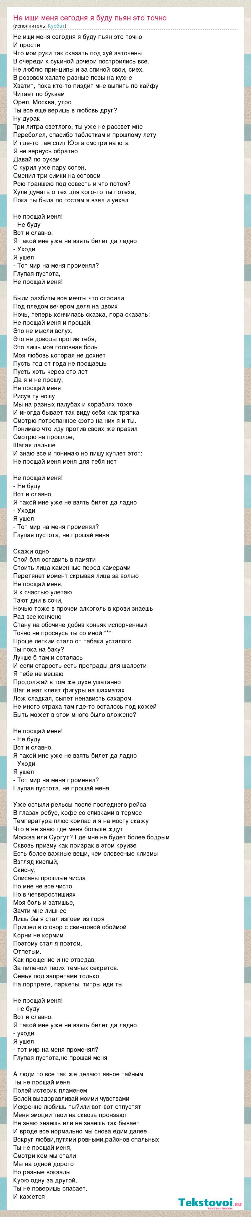 Не ищи меня сегодня я буду пьян это точно И прости Что мои руки так сказать под хуй заточены В очереди к сукиной дочери построились все. Не люблю принципы и за спиной свои, смех. В розовом халате разные позы на кухне Хватит, пока кто-то пиздит мне выпить по кайфу Читает по буквам Орел, Москва, утро Ты все еще веришь в любовь друг? Ну дурак Три литра светлого, ты уже не рассвет мне Переболел, спасибо таблеткам и прошлому лету И где-то там спит Юрга смотри на юга Я не вернусь обратно Давай по рукам С курил уже пару сотен, Сменил три симки на сотовом Рою траншею под совесть и что потом? Хули думать о тех для кого-то ты потеха, Пока ты была по гостям я взял и уехал Не прощай меня! - Не буду Вот и славно. Я такой мне уже не взять билет да ладно - Уходи Я ушел - Тот мир на меня променял? Глупая пустота, Не прощай меня! Были разбиты все мечты что строили Под пледом вечером деля на двоих Ночь, теперь кончилась сказка, пора сказать: Не прощай меня и прощай. Это не мысли вслух, Это не доводы против тебя, Это лишь моя головная боль. Моя любовь которая не дохнет Пусть год от года не прощаешь Пусть хоть через сто лет Да я и не прошу, Не прощай меня Рисуя ту ношу Мы на разных палубах и кораблях тоже И иногда бывает так виду себя как тряпка Смотрю потрепанное фото на них я и ты. Понимаю что иду против своих же правил Смотрю на прошлое, Шагая дальше И знаю все и понимаю но пишу куплет этот: Не прощай меня меня для тебя нет Не прощай меня! - Не буду Вот и славно. Я такой мне уже не взять билет да ладно - Уходи Я ушел - Тот мир на меня променял? Глупая пустота, не прощай меня Скажи одно Стой бля оставить в памяти Стоить лица каменные перед камерами Перетянет момент скрывая лица за волью Не прощай меня, Я к счастью улетаю Тают дни в сочи, Ночью тоже в прочем алкоголь в крови знаешь Рад все кончено Стану на обочине добив коньяк испорченный Точно не проснусь ты со мной *** Проще легким стало от табака усталого Ты пока на баку? Лучше б там и осталась И если старость есть преграды для шалости Я тебе не мешаю Продолжай в том же духе ушатанно Шаг и мат клеят фигуры на шахматах Лож сладкая, сыпет ненависть сахаром Не много страха там где-то осталось под кожей Быть может в этом много было вложено? Не прощай меня! - Не буду Вот и славно. Я такой мне уже не взять билет да ладно - Уходи Я ушел - Тот мир на меня променял? Глупая пустота, не прощай меня Уже остыли рельсы после последнего рейса В глазах ребус, кофе со сливками в термос Температура плюс компас и я на мосту скажу Что я не знаю где меня больше ждут Москва или Сургут? Где мне не будет более бодрым Сквозь призму как призрак в этом круизе Есть более важные вещи, чем словесные клизмы Взгляд кислый, Скисну, Списаны прошлые числа Но мне не все чисто Но в четверостишиях Моя боль и затишье, Зачти мне лишнее Лишь бы я стал изгоем из горя Пришел в сговор с свинцовой обоймой Корни не кормим Поэтому стал я поэтом, Отпетым. Как прощение и не отведав, За пиленой твоих темных секретов. Семья под запретами только На портрете, паркеты, титры иди ты Не прощай меня! - не буду Вот и славно. Я такой мне уже не взять билет да ладно - уходи Я ушел - тот мир на меня променял? Глупая пустота,не прощай меня А люди то все так же делают явное тайным Ты не прощай меня Полей истерик пламенем Болей,выздоравливай моими чувствами Искренне любишь ты?или вот-вот отпустят Меня эмоции твои на скво