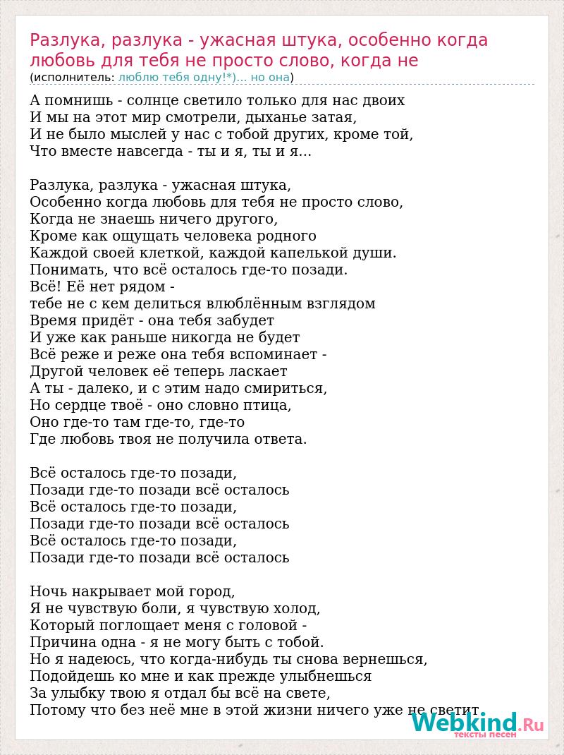 Главная→Исполнители→Люблю тебя одну!*)... но она→Разлука, разлука - ужасная штука, особенно когда любовь для тебя не просто с