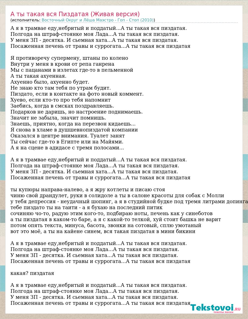 А я в трамвае еду,небритый и поддатый...А ты такая вся пиздатая. Полгода на штраф-стоянке моя Лада...А ты такая вся пиздатая. У меня ЗП - десятка. И сьемная хата...А ты такая вся пиздатая. Посаженная печень от травы и суррогата...А ты такая вся пиздатая Я противоречу супермену, штаны по колено Внутри у меня в крови от репа ганрена Мы с пацанами в излетах где-то в пельменной А ты такая ахуенная. Ахуенно было, ахуенно будет. Не знаю кто там тебя по утрам будит. Пиздато, если в контакте на фото новый коммент. Хуево, если кто-то про тебя напомнит Заебись, когда в смсках поздравляешь. Подарков не даришь, но настроение поднимаешь. Значит не забыла, значит помнишь. Знаешь, приятно, когда на перезвон кидаешь... Я снова в хламе в душшевнопиздатой компании Оказался в центре внимания. Туалет занят Ты сейчас где-то в Египте или на Майями. А я на сцене в адидасе с тремя полосами... А я в трамвае еду,небритый и поддатый...А ты такая вся пиздатая. Полгода на штраф-стоянке моя Лада...А ты такая вся пиздатая. У меня ЗП - десятка. И сьемная хата...А ты такая вся пиздатая. Посаженная печень от травы и суррогата...А ты такая вся пиздатая ты купюры направа-налево, а я жру котлеты и писаю стоя чиню свой драндулет, руки в солидоле а ты в салоне красоты для собак с Молли у тебя депрессия - неудачный шопинг, а я в студийной будке под тремя литрами допинга тебе пиздато ты на таити - а я бухаю на последний питик сочиняю чо-то, радую этим кого-то, подбираю ноты, печень как у синеботов а ты пиздатая в каком-то баре, а я с какой-то телкой, хуй стоит башка не варит потом опять текста, минуса, басота, звонки на сотовый, сплю умотаный вот это моё, а ты на кайене синем, вся такая пиздатая в мини бикини А я в трамвае еду,небритый и поддатый...А ты такая вся пиздатая. Полгода на штраф-стоянке моя Лада...А ты такая вся пиздатая. У меня ЗП - десятка. И сьемная хата...А ты такая вся пиздатая. Посаженная печень от травы и суррогата...А ты такая вся пиздатая какая? пиздатая А я в трамвае еду,небритый и поддатый...А ты такая вся пиздатая. Полгода на штраф-стоянке моя Лада...А ты такая вся пиздатая. У меня ЗП - десятка. И сьемная хата...А ты такая вся пиздатая. Посаженная печень от травы и суррогата...А ты такая вся пиздатая.