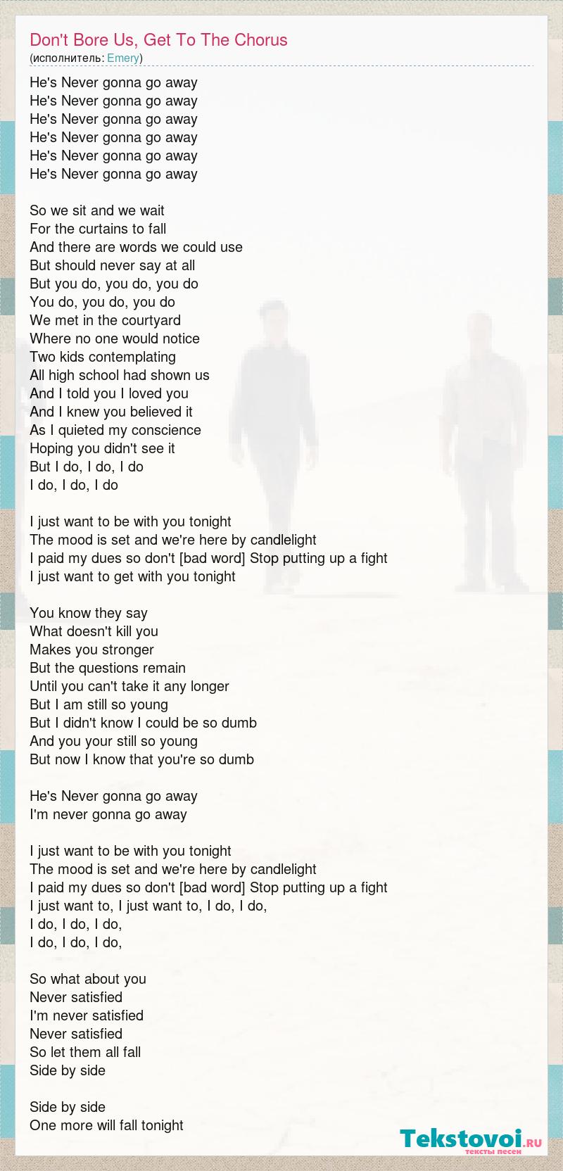 He's Never gonna go away He's Never gonna go away He's Never gonna go away He's Never gonna go away He's Never gonna go away He's Never gonna go away So we sit and we wait For the curtains to fall And there are words we could use But should never say at all But you do, you do, you do You do, you do, you do We met in the courtyard Where no one would notice Two kids contemplating All high school had shown us And I told you I loved you And I knew you believed it As I quieted my conscience Hoping you didn't see it But I do, I do, I do I do, I do, I do I just want to be with you tonight The mood is set and we're here by candlelight I paid my dues so don't [bad word] Stop putting up a fight I just want to get with you tonight You know they say What doesn't kill you Makes you stronger But the questions remain Until you can't take it any longer But I am still so young But I didn't know I could be so dumb And you your still so young But now I know that you're so dumb He's Never gonna go away I'm never gonna go away I just want to be with you tonight The mood is set and we're here by candlelight I paid my dues so don't [bad word] Stop putting up a fight I just want to, I just want to, I do, I do, I do, I do, I do, I do, I do, I do, So what about you Never satisfied I'm never satisfied Never satisfied So let them all fall Side by side Side by side One more will fall tonight