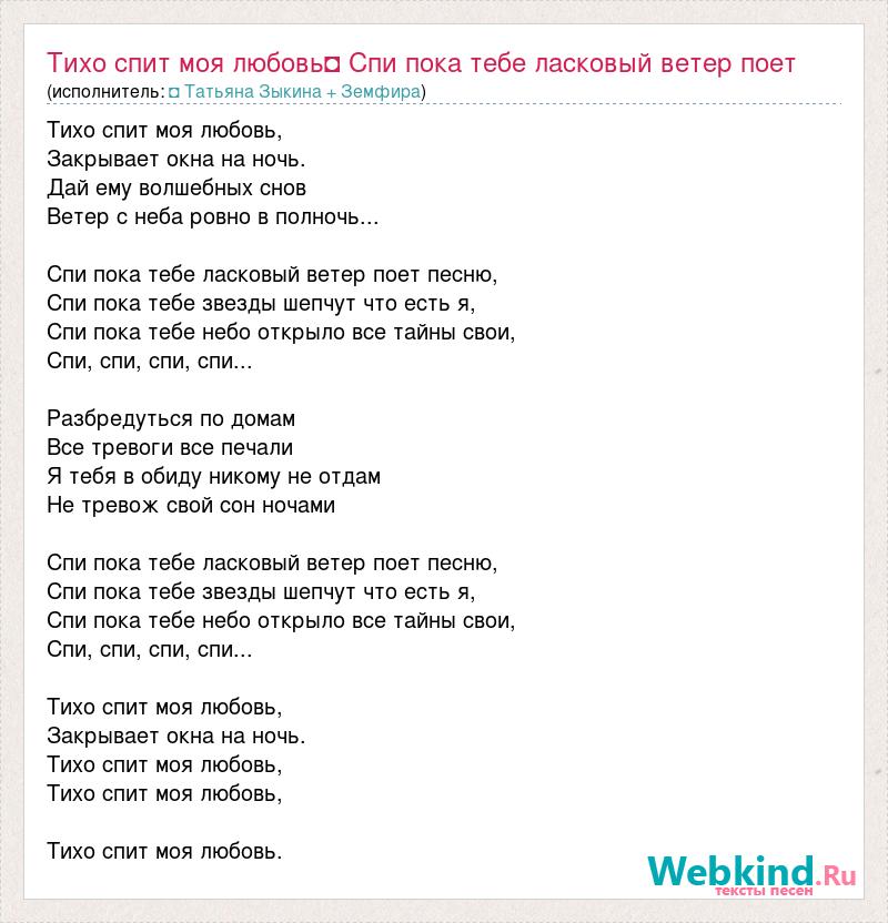 Тихо спит моя любовь, Закрывает окна на ночь. Дай ему волшебных снов Ветер с неба ровно в полночь... Спи пока тебе ласковый ветер поет песню, Спи пока тебе звезды шепчут что есть я, Спи пока тебе небо открыло все тайны свои, Спи, спи, спи, спи... Разбредуться по домам Все тревоги все печали Я тебя в обиду никому не отдам Не тревож свой сон ночами Спи пока тебе ласковый ветер поет песню, Спи пока тебе звезды шепчут что есть я, Спи пока тебе небо открыло все тайны свои, Спи, спи, спи, спи... Тихо спит моя любовь, Закрывает окна на ночь. Тихо спит моя любовь, Тихо спит моя любовь, Тихо спит моя любовь.