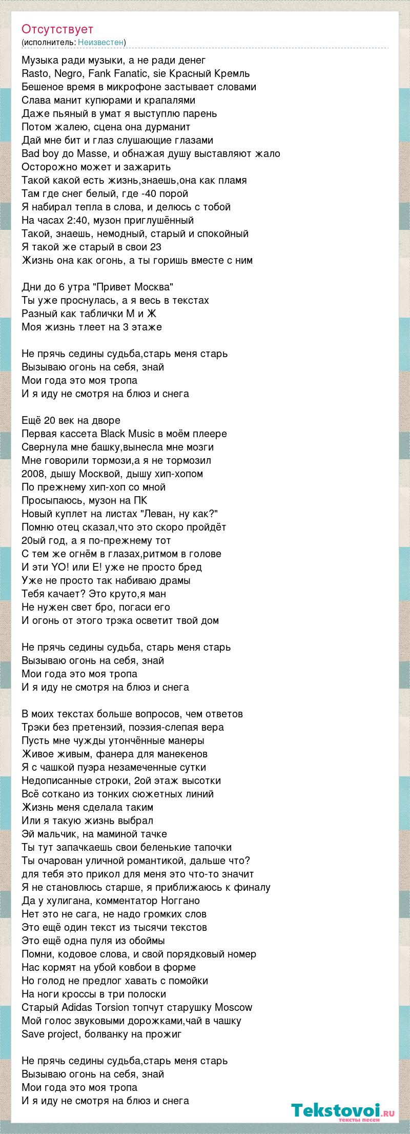 Музыка ради музыки, а не ради денег Rasto, Negro, Fank Fanatic, sie Красный Кремль Бешеное время в микрофоне застывает словами Слава манит купюрами и крапалями Даже пьяный в умат я выступлю парень Потом жалею, сцена она дурманит Дай мне бит и глаз слушающие глазами Bad boy до Masse, и обнажая душу выставляют жало Осторожно может и зажарить Такой какой есть жизнь,знаешь,она как пламя Там где снег белый, где -40 порой Я набирал тепла в слова, и делюсь с тобой На часах 2:40, музон приглушённый Такой, знаешь, немодный, старый и спокойный Я такой же старый в свои 23 Жизнь она как огонь, а ты горишь вместе с ним Дни до 6 утра "Привет Москва" Ты уже проснулась, а я весь в текстах Разный как таблички М и Ж Моя жизнь тлеет на 3 этаже Не прячь седины судьба,старь меня старь Вызываю огонь на себя, знай Мои года это моя тропа И я иду не смотря на блюз и снега Ещё 20 век на дворе Первая кассета Black Music в моём плеере Свернула мне башку,вынесла мне мозги Мне говорили тормози,а я не тормозил 2008, дышу Москвой, дышу хип-хопом По прежнему хип-хоп со мной Просыпаюсь, музон на ПК Новый куплет на листах "Леван, ну как?" Помню отец сказал,что это скоро пройдёт 20ый год, а я по-прежнему тот С тем же огнём в глазах,ритмом в голове И эти YO! или E! уже не просто бред Уже не просто так набиваю драмы Тебя качает? Это круто,я ман Не нужен свет бро, погаси его И огонь от этого трэка осветит твой дом Не прячь седины судьба, старь меня старь Вызываю огонь на себя, знай Мои года это моя тропа И я иду не смотря на блюз и снега В моих текстах больше вопросов, чем ответов Трэки без претензий, поэзия-слепая вера Пусть мне чужды утончённые манеры Живое живым, фанера для манекенов Я с чашкой пуэра незамеченные сутки Недописанные строки, 2ой этаж высотки Всё соткано из тонких сюжетных линий Жизнь меня сделала таким Или я такую жизнь выбрал Эй мальчик, на маминой тачке Ты тут запачкаешь свои беленькие тапочки Ты очарован уличной романтикой, дальше что? для тебя это прикол для меня это что-то значит Я не становлюсь старше, я приближаюсь к финалу Да у хулигана, комментатор Ноггано Нет это не сага, не надо громких слов Это ещё один текст из тысячи текстов Это ещё одна пуля из обоймы Помни, кодовое слова, и свой порядковый номер Нас кормят на убой ковбои в форме Но голод не предлог хавать с помойки На ноги кроссы в три полоски Старый Adidas Torsion топчут старушку Moscow Мой голос звуковыми дорожками,чай в чашку Save projeсt, болванку на прожиг Не прячь седины судьба,старь меня старь Вызываю огонь на себя, знай Мои года это моя тропа И я иду не смотря на блюз и снега