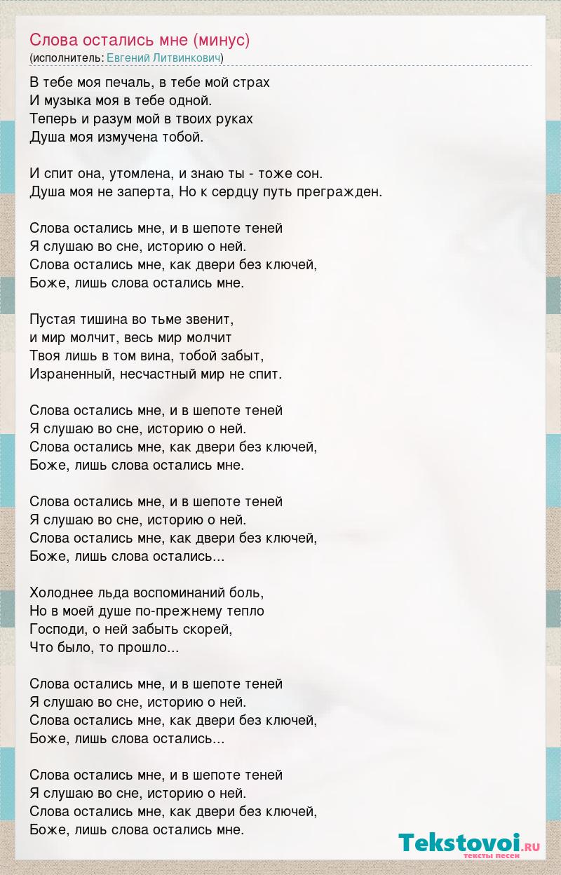 В тебе моя печаль, в тебе мой страх И музыка моя в тебе одной. Теперь и разум мой в твоих руках Душа моя измучена тобой. И спит она, утомлена, и знаю ты - тоже сон. Душа моя не заперта, Но к сердцу путь прегражден. Слова остались мне, и в шепоте теней Я слушаю во сне, историю о ней. Слова остались мне, как двери без ключей, Боже, лишь слова остались мне. Пустая тишина во тьме звенит, и мир молчит, весь мир молчит Твоя лишь в том вина, тобой забыт, Израненный, несчастный мир не спит. Слова остались мне, и в шепоте теней Я слушаю во сне, историю о ней. Слова остались мне, как двери без ключей, Боже, лишь слова остались мне. Слова остались мне, и в шепоте теней Я слушаю во сне, историю о ней. Слова остались мне, как двери без ключей, Боже, лишь слова остались... Холоднее льда воспоминаний боль, Но в моей душе по-прежнему тепло Господи, о ней забыть скорей, Что было, то прошло... Слова остались мне, и в шепоте теней Я слушаю во сне, историю о ней. Слова остались мне, как двери без ключей, Боже, лишь слова остались... Слова остались мне, и в шепоте теней Я слушаю во сне, историю о ней. Слова остались мне, как двери без ключей, Боже, лишь слова остались мне.