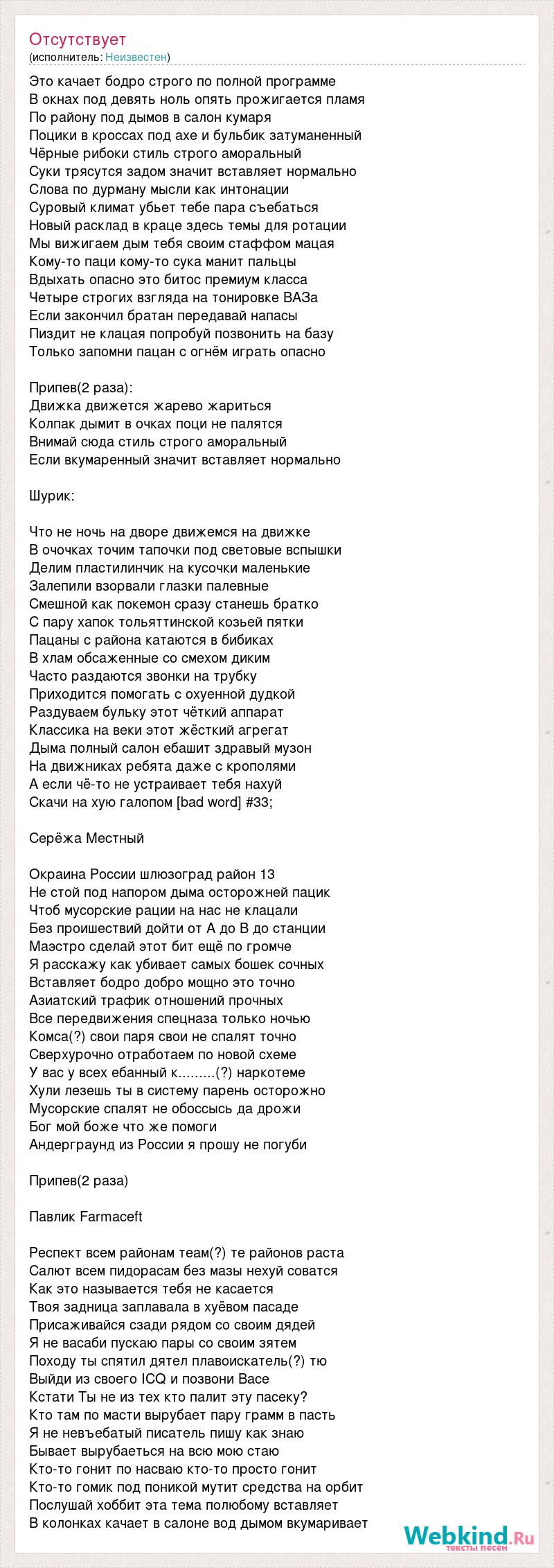 Это качает бодро строго по полной программе В окнах под девять ноль опять прожигается пламя По району под дымов в салон кумаря Поцики в кроссах под ахе и бульбик затуманенный Чёрные рибоки стиль строго аморальный Суки трясутся задом значит вставляет нормально Слова по дурману мысли как интонации Суровый климат убьет тебе пара съебаться Новый расклад в краце здесь темы для ротации Мы вижигаем дым тебя своим стаффом мацая Кому-то паци кому-то сука манит пальцы Вдыхать опасно это битос премиум класса Четыре строгих взгляда на тонировке ВАЗа Если закончил братан передавай напасы Пиздит не клацая попробуй позвонить на базу Только запомни пацан с огнём играть опасно Припев(2 раза): Движка движется жарево жариться Колпак дымит в очках поци не палятся Внимай сюда стиль строго аморальный Если вкумаренный значит вставляет нормально Шурик: Что не ночь на дворе движемся на движке В очочках точим тапочки под световые вспышки Делим пластилинчик на кусочки маленькие Залепили взорвали глазки палевные Смешной как покемон сразу станешь братко С пару хапок тольяттинской козьей пятки Пацаны с района катаются в бибиках В хлам обсаженные со смехом диким Часто раздаются звонки на трубку Приходится помогать с охуенной дудкой Раздуваем бульку этот чёткий аппарат Классика на веки этот жёсткий агрегат Дыма полный салон ебашит здравый музон На движниках ребята даже с крополями А если чё-то не устраивает тебя нахуй Скачи на хую галопом [bad word] #33; Серёжа Местный Окраина России шлюзоград район 13 Не стой под напором дыма осторожней пацик Чтоб мусорские рации на нас не клацали Без проишествий дойти от А до В до станции Маэстро сделай этот бит ещё по громче Я расскажу как убивает самых бошек сочных Вставляет бодро добро мощно это точно Азиатский трафик отношений прочных Все передвижения спецназа только ночью Комса(?) свои паря свои не спалят точно Сверхурочно отработаем по новой схеме У вас у всех ебанный к.........(?) наркотеме Хули лезешь ты в систему парень осторожно Мусорские спалят не обоссысь да дрожи Бог мой боже что же помоги Андерграунд из России я прошу не погуби Припев(2 раза) Павлик Farmaceft Респект всем районам теам(?) те районов раста Салют всем пидорасам без мазы нехуй соватся Как это называется тебя не касается Твоя задница заплавала в хуёвом пасаде Присаживайся сзади рядом со своим дядей Я не васаби пускаю пары со своим зятем Походу ты спятил дятел плавоискатель(?) тю Выйди из своего ICQ и позвони Васе Кстати Ты не из тех кто палит эту пасеку? Кто там по масти вырубает пару грамм в пасть Я не невъебатый писатель пишу как знаю Бывает вырубаеться на всю мою стаю Кто-то гонит по насваю кто-то просто гонит Кто-то гомик под поникой мутит средства на орбит Послушай хоббит эта тема полюбому вставляет В колонках качает в салоне вод дымом вкумаривает