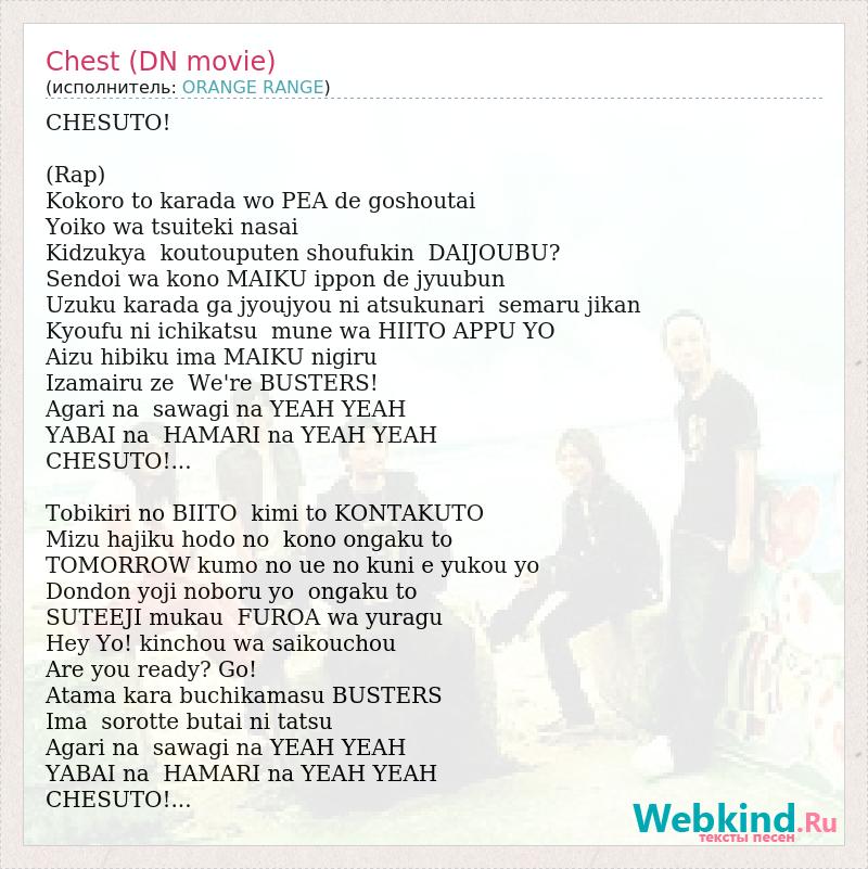 CHESUTO! (Rap) Kokoro to karada wo PEA de goshoutai Yoiko wa tsuiteki nasai Kidzukya koutouputen shoufukin DAIJOUBU? Sendoi wa kono MAIKU ippon de jyuubun Uzuku karada ga jyoujyou ni atsukunari semaru jikan Kyoufu ni ichikatsu mune wa HIITO APPU YO Aizu hibiku ima MAIKU nigiru Izamairu ze We're BUSTERS! Agari na sawagi na YEAH YEAH YABAI na HAMARI na YEAH YEAH CHESUTO!... Tobikiri no BIITO kimi to KONTAKUTO Mizu hajiku hodo no kono ongaku to TOMORROW kumo no ue no kuni e yukou yo Dondon yoji noboru yo ongaku to SUTEEJI mukau FUROA wa yuragu Hey Yo! kinchou wa saikouchou Are you ready? Go! Atama kara buchikamasu BUSTERS Ima sorotte butai ni tatsu Agari na sawagi na YEAH YEAH YABAI na HAMARI na YEAH YEAH CHESUTO!...