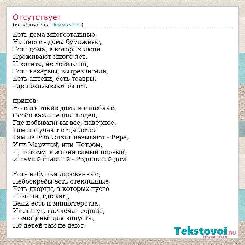 Есть дома многозтажные, Hа листе - дома бумажные, Есть дома, в которых люди Проживают много лет. И хотите, не хотите ли, Есть казармы, вытрезвители, Есть аптеки, есть театры, Где показывают балет. припев: Hо есть такие дома волшебные, Особо важные для людей, Где побывали вы все, наверное, Там получают отцы детей Там на всю жизнь называют - Вера, Или Мариной, или Петром, И, потому, в жизни самый первый, И самый главный - Родильный дом. Есть избушки деревянные, Hебоскребы есть стеклянные, Есть дворцы, в которых пусто И отели, где уют, Бани есть и министерства, Институт, где лечат сердце, Помещенье для капусты, Hо детей там не дают.