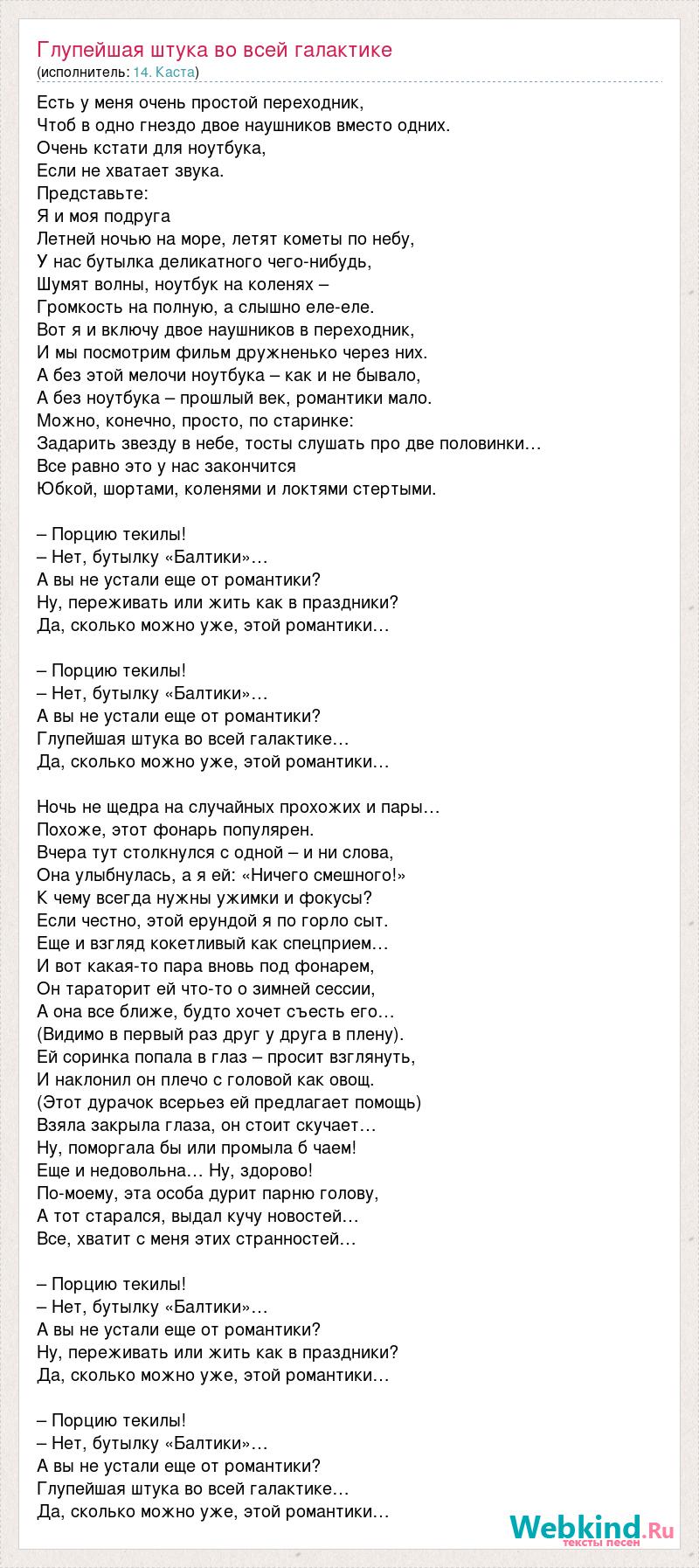 Есть у меня очень простой переходник, Чтоб в одно гнездо двое наушников вместо одних. Очень кстати для ноутбука, Если не хватает звука. Представьте: Я и моя подруга Летней ночью на море, летят кометы по небу, У нас бутылка деликатного чего-нибудь, Шумят волны, ноутбук на коленях – Громкость на полную, а слышно еле-еле. Вот я и включу двое наушников в переходник, И мы посмотрим фильм дружненько через них. А без этой мелочи ноутбука – как и не бывало, А без ноутбука – прошлый век, романтики мало. Можно, конечно, просто, по старинке: Задарить звезду в небе, тосты слушать про две половинки… Все равно это у нас закончится Юбкой, шортами, коленями и локтями стертыми. – Порцию текилы! – Нет, бутылку «Балтики»… А вы не устали еще от романтики? Ну, переживать или жить как в праздники? Да, сколько можно уже, этой романтики… – Порцию текилы! – Нет, бутылку «Балтики»… А вы не устали еще от романтики? Глупейшая штука во всей галактике… Да, сколько можно уже, этой романтики… Ночь не щедра на случайных прохожих и пары… Похоже, этот фонарь популярен. Вчера тут столкнулся с одной – и ни слова, Она улыбнулась, а я ей: «Ничего смешного!» К чему всегда нужны ужимки и фокусы? Если честно, этой ерундой я по горло сыт. Еще и взгляд кокетливый как спецприем… И вот какая-то пара вновь под фонарем, Он тараторит ей что-то о зимней сессии, А она все ближе, будто хочет съесть его… (Видимо в первый раз друг у друга в плену). Ей соринка попала в глаз – просит взглянуть, И наклонил он плечо с головой как овощ. (Этот дурачок всерьез ей предлагает помощь) Взяла закрыла глаза, он стоит скучает… Ну, поморгала бы или промыла б чаем! Еще и недовольна… Ну, здорово! По-моему, эта особа дурит парню голову, А тот старался, выдал кучу новостей… Все, хватит с меня этих странностей… – Порцию текилы! – Нет, бутылку «Балтики»… А вы не устали еще от романтики? Ну, переживать или жить как в праздники? Да, сколько можно уже, этой романтики… – Порцию текилы! – Нет, бутылку «Балтики»… А вы не устали еще от романтики? Глупейшая штука во всей галактике… Да, сколько можно уже, этой романтики…