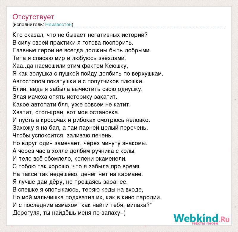 Кто сказал, что не бывает негативных историй? В силу своей практики я готова поспорить. Главные герои не всегда должны быть добрыми. Типа я спасаю мир и любуюсь звёздами. Хаа..да насмешили этим фактом Ксюшку, Я как золушка с пушкой пойду долбить по верхушкам. Автостопом покатушки и с попутчиков плюшки. Блин, ведь я забыла вычистить свою однушку. Злая мачеха опять истерику закатит. Какое автопати бля, уже совсем не катит. Хватит, стоп-кран, вот моя остановка. И пусть в кросочах и рибоках смотрюсь неловко. Захожу я на бал, а там парней целый перечень. Чтобы успокоится, заливаю печень. Но вдруг один замечает, через минуту знакомы. А через час в холле долбим ручника с колы. И тело всё обомлело, колени окаменели. С тобою так хорошо, что я забыла про время. На такси так недёшево, денег нет на кармане. Я лучше дам дёру, не прощаясь заранее. В спешке я спотыкаюсь, теряю кеды на входе, Но мой мальчишка подхватил их, как в кино пародии. И с последним взмахом "как найти тебя, милаха?" Дорогуля, ты найдёшь меня по запаху=)