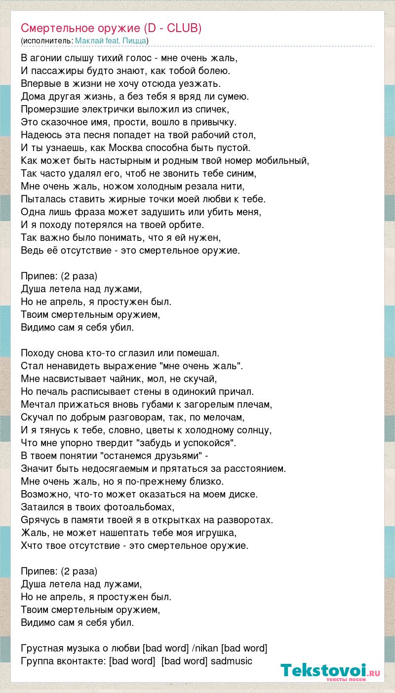 В агонии слышу тихий голос - мне очень жаль, И пассажиры будто знают, как тобой болею. Впервые в жизни не хочу отсюда уезжать. Дома другая жизнь, а без тебя я вряд ли сумею. Промерзшие электрички выложил из спичек, Это сказочное имя, прости, вошло в привычку. Надеюсь эта песня попадет на твой рабочий стол, И ты узнаешь, как Москва способна быть пустой. Как может быть настырным и родным твой номер мобильный, Так часто удалял его, чтоб не звонить тебе синим, Мне очень жаль, ножом холодным резала нити, Пыталась ставить жирные точки моей любви к тебе. Одна лишь фраза может задушить или убить меня, И я походу потерялся на твоей орбите. Так важно было понимать, что я ей нужен, Ведь её отсутствие - это смертельное оружие. Припев: (2 раза) Душа летела над лужами, Но не апрель, я простужен был. Твоим смертельным оружием, Видимо сам я себя убил. Походу снова кто-то сглазил или помешал. Стал ненавидеть выражение "мне очень жаль". Мне насвистывает чайник, мол, не скучай, Но печаль расписывает стены в одинокий причал. Мечтал прижаться вновь губами к загорелым плечам, Скучал по добрым разговорам, так, по мелочам, И я тянусь к тебе, словно, цветы к холодному солнцу, Что мне упорно твердит "забудь и успокойся". В твоем понятии "останемся друзьями" - Значит быть недосягаемым и прятаться за расстоянием. Мне очень жаль, но я по-прежнему близко. Возможно, что-то может оказаться на моем диске. Затаился в твоих фотоальбомах, Gрячусь в памяти твоей я в открытках на разворотах. Жаль, не может нашептать тебе моя игрушка, Xчто твое отсутствие - это смертельное оружие. Припев: (2 раза) Душа летела над лужами, Но не апрель, я простужен был. Твоим смертельным оружием, Видимо сам я себя убил. Грустная музыка о любви [bad word] /nikan [bad word] Группа вконтакте: [bad word] [bad word] sadmusic