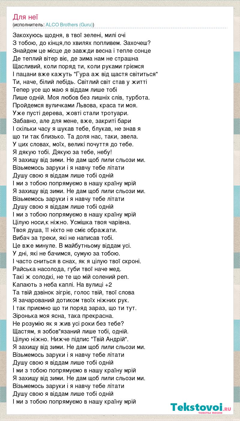 Закохуюсь щодня, в твої зелені, милі очі З тобою, до кінця,по хвилях попливем. Захочеш? Знайдем це місце де завжди весна і тепле сонце Де теплий вітер віє, де зима нам не страшна Щасливий, коли поряд ти, коли руками гріємся І пацани вже кажуть "Гура аж від щастя світиться" Ти, наче, білий лебідь. Світлий світ став у житті Тепер усе що маю я віддам лише тобі Лише одній. Моя любов без лишніх слів, турбота. Пройдемся вуличками Львова, краса ти моя. Уже пусті дерева, жовті стали тротуари. Забавно, але для мене, вже, закриті бари І скільки часу я шукав тебе, блукав, не знав я що ти так близько. Та доля нас, таки, звела. У цих словах, моїх, великі почуття до тебе. Я дякую тобі. Дякую за тебе, небу! Я захищу від зими. Не дам щоб лили сльози ми. Візьмемось заруки і я навчу тебе літати Душу свою я віддам лише тобі одній І ми з тобою попрямуємо в нашу країну мрій Я захищу від зими. Не дам щоб лили сльози ми. Візьмемось заруки і я навчу тебе літати Душу свою я віддам лише тобі одній І ми з тобою попрямуємо в нашу країну мрій Цілую носи,к ніжно. Усмішка твоя чарівна. Твоя душа, її ніхто не сміє ображати. Вибач за треки, які не написав тобі. Це вже минуле. В майбутньому віддам усі. У дні, які не бачимся, сумую за тобою. І часто сниться в снах, як я цілую твої скроні. Райська насолода, губи твої наче мед. Такі ж солодкі, не те що мій солений реп. Капають з неба каплі. На вулиці +2 Та твій дзвінок зігріє, голос твій, твої слова Я зачарований дотиком твоїх ніжних рук. І так приємно що ти поряд зараз, що ти тут. Зіронька моя ясна, така прекрасна. Не розумію як я жив усі роки без тебе? Щастям, я зобов"язаний лише тобі, одній. Цілую ніжно. Нижче підпис "Твій Андрій". Я захищу від зими. Не дам щоб лили сльози ми. Візьмемось заруки і я навчу тебе літати Душу свою я віддам лише тобі одній І ми з тобою попрямуємо в нашу країну мрій Я захищу від зими. Не дам щоб лили сльози ми. Візьмемось заруки і я навчу тебе літати Душу свою я віддам лише тобі одній І ми з тобою попрямуємо в нашу країну мрій