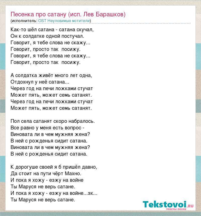 Как-то шёл сатана - сатана скучал, Он к солдатке одной постучал. Говорит, я тебе слова не скажу... Говорит, просто так посижу. Говорит, я тебе слова не скажу... Говорит, просто так посижу. А солдатка живёт много лет одна, Отдохнул у неё сатана... Через год на печи ложками стучат Может пять, может семь сатанят. Через год на печи ложками стучат Может пять, может семь сатанят. Пол села сатанят скоро набралось. Все равно у меня есть вопрос - Виновата ли в чем мужняя жена? В ней с рожденья сидит сатана. Виновата ли в чем мужняя жена? В ней с рожденья сидит сатана. К дорогуше своей я б пришёл давно, Да стоит на пути чёрт Махно. И пока я хожу - езжу на войне Ты Маруся не верь сатане. И пока я хожу - езжу на войне...эх... Ты Маруся не верь сатане.