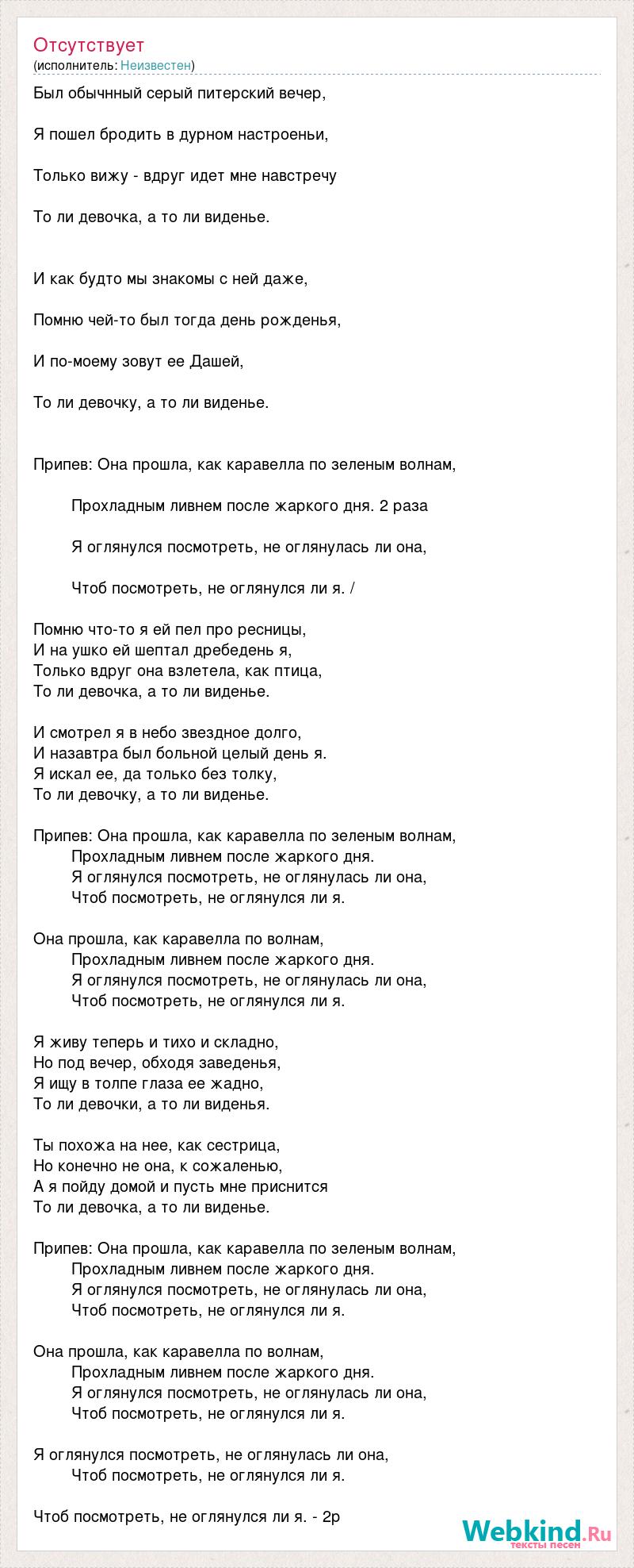 Припев: Она прошла, как каравелла по зеленым волнам,