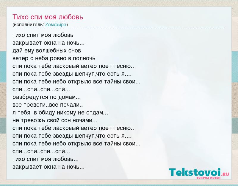 тихо спит моя любовь закрывает окна на ночь... дай ему волшебных снов ветер с неба ровно в полночь спи пока тебе ласковый ветер поет песню.. спи пока тебе звезды шепчут,что есть я.... спи пока тебе небо открыло все тайны свои... спи...спи..спи...спи... разбредутся по домам... все тревоги..все печали.. я тебя в обиду никому не отдам... не тревожь свой сон ночами... спи пока тебе ласковый ветер поет песню.. спи пока тебе звезды шепчут,что есть я.... спи пока тебе небо открыло все тайны свои... спи...спи..спи...спи... тихо спит моя любовь... закрывает окна на ночь...