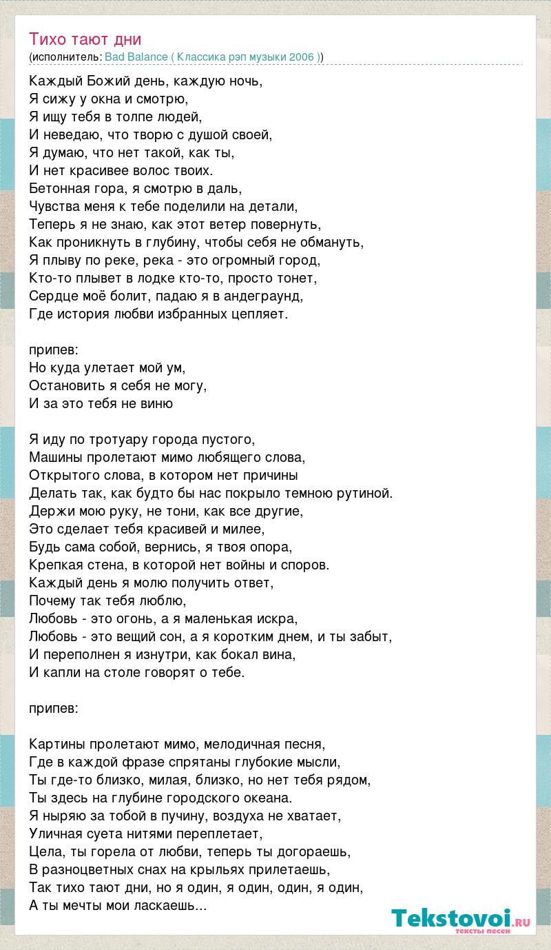 Каждый Божий день, каждую ночь, Я сижу у окна и смотрю, Я ищу тебя в толпе людей, И неведаю, что творю с душой своей, Я думаю, что нет такой, как ты, И нет красивее волос твоих. Бетонная гора, я смотрю в даль, Чувства меня к тебе поделили на детали, Теперь я не знаю, как этот ветер повернуть, Как проникнуть в глубину, чтобы себя не обмануть, Я плыву по реке, река - это огромный город, Кто-то плывет в лодке кто-то, просто тонет, Сердце моё болит, падаю я в андеграунд, Где история любви избранных цепляет. припев: Но куда улетает мой ум, Остановить я себя не могу, И за это тебя не виню Я иду по тротуару города пустого, Машины пролетают мимо любящего слова, Открытого слова, в котором нет причины Делать так, как будто бы нас покрыло темною рутиной. Держи мою руку, не тони, как все другие, Это сделает тебя красивей и милее, Будь сама собой, вернись, я твоя опора, Крепкая стена, в которой нет войны и споров. Каждый день я молю получить ответ, Почему так тебя люблю, Любовь - это огонь, а я маленькая искра, Любовь - это вещий сон, а я коротким днем, и ты забыт, И переполнен я изнутри, как бокал вина, И капли на столе говорят о тебе. припев: Картины пролетают мимо, мелодичная песня, Где в каждой фразе спрятаны глубокие мысли, Ты где-то близко, милая, близко, но нет тебя рядом, Ты здесь на глубине городского океана. Я ныряю за тобой в пучину, воздуха не хватает, Уличная суета нитями переплетает, Цела, ты горела от любви, теперь ты догораешь, В разноцветных снах на крыльях прилетаешь, Так тихо тают дни, но я один, я один, один, я один, А ты мечты мои ласкаешь...