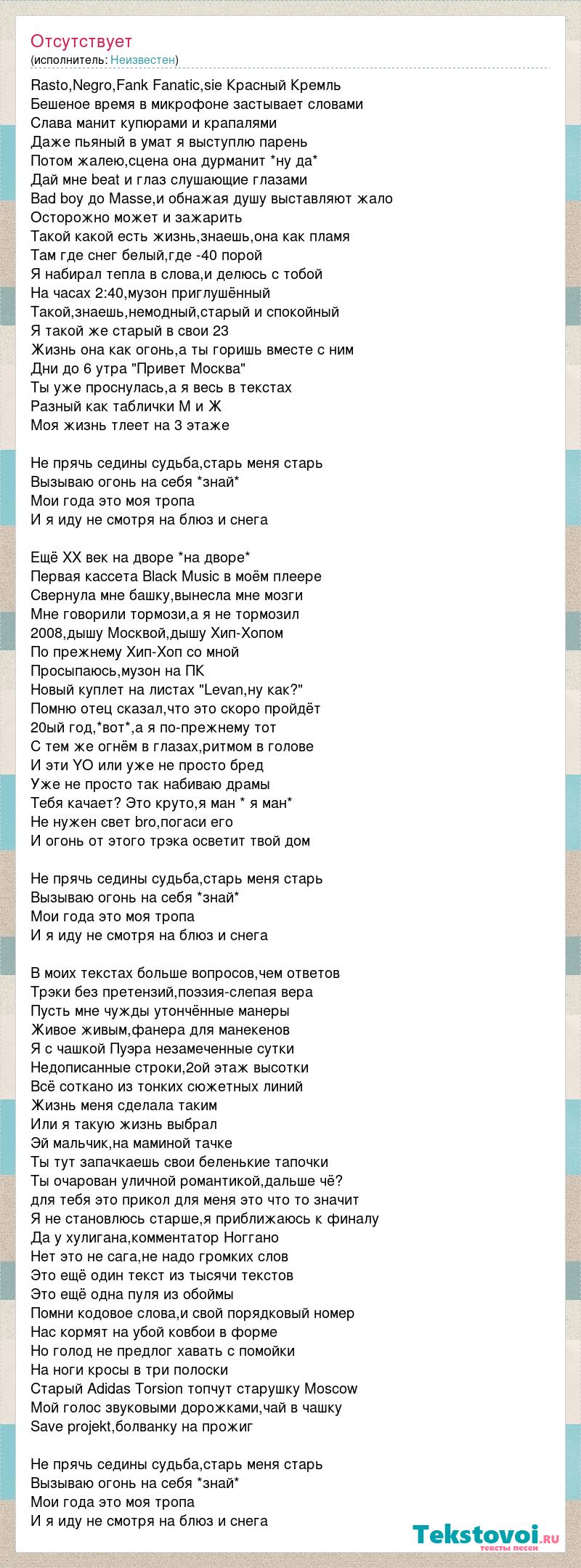 Rasto,Negro,Fank Fanatic,sie Красный Кремль Бешеное время в микрофоне застывает словами Слава манит купюрами и крапалями Даже пьяный в умат я выступлю парень Потом жалею,сцена она дурманит *ну да* Дай мне beat и глаз слушающие глазами Bad boy до Masse,и обнажая душу выставляют жало Осторожно может и зажарить Такой какой есть жизнь,знаешь,она как пламя Там где снег белый,где -40 порой Я набирал тепла в слова,и делюсь с тобой На часах 2:40,музон приглушённый Такой,знаешь,немодный,старый и спокойный Я такой же старый в свои 23 Жизнь она как огонь,а ты горишь вместе с ним Дни до 6 утра "Привет Москва" Ты уже проснулась,а я весь в текстах Разный как таблички М и Ж Моя жизнь тлеет на 3 этаже Не прячь седины судьба,старь меня старь Вызываю огонь на себя *знай* Мои года это моя тропа И я иду не смотря на блюз и снега Ещё XX век на дворе *на дворе* Первая кассета Black Music в моём плеере Свернула мне башку,вынесла мне мозги Мне говорили тормози,а я не тормозил 2008,дышу Москвой,дышу Хип-Хопом По прежнему Хип-Хоп со мной Просыпаюсь,музон на ПК Новый куплет на листах "Levan,ну как?" Помню отец сказал,что это скоро пройдёт 20ый год,*вот*,а я по-прежнему тот С тем же огнём в глазах,ритмом в голове И эти YO или уже не просто бред Уже не просто так набиваю драмы Тебя качает? Это круто,я ман * я ман* Не нужен свет brо,погаси его И огонь от этого трэка осветит твой дом Не прячь седины судьба,старь меня старь Вызываю огонь на себя *знай* Мои года это моя тропа И я иду не смотря на блюз и снега В моих текстах больше вопросов,чем ответов Трэки без претензий,поэзия-слепая вера Пусть мне чужды утончённые манеры Живое живым,фанера для манекенов Я с чашкой Пуэра незамеченные сутки Недописанные строки,2ой этаж высотки Всё соткано из тонких сюжетных линий Жизнь меня сделала таким Или я такую жизнь выбрал Эй мальчик,на маминой тачке Ты тут запачкаешь свои беленькие тапочки Ты очарован уличной романтикой,дальше чё? для тебя это прикол для меня это что то значит Я не становлюсь старше,я приближаюсь к финалу Да у хулигана,комментатор Ноггано Нет это не сага,не надо громких слов Это ещё один текст из тысячи текстов Это ещё одна пуля из обоймы Помни кодовое слова,и свой порядковый номер Нас кормят на убой ковбои в форме Но голод не предлог хавать с помойки На ноги кросы в три полоски Старый Adidas Torsion топчут старушку Moscow Мой голос звуковыми дорожками,чай в чашку Save projekt,болванку на прожиг Не прячь седины судьба,старь меня старь Вызываю огонь на себя *знай* Мои года это моя тропа И я иду не смотря на блюз и снега