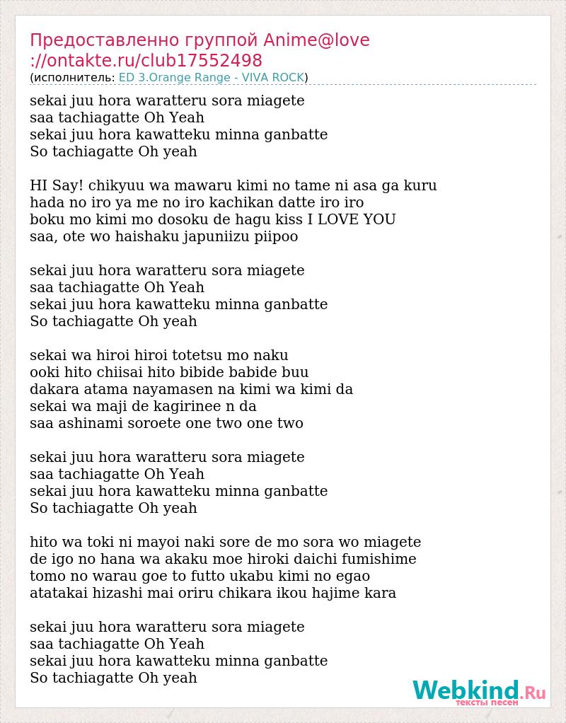 sekai juu hora waratteru sora miagete saa tachiagatte Oh Yeah sekai juu hora kawatteku minna ganbatte So tachiagatte Oh yeah HI Say! chikyuu wa mawaru kimi no tame ni asa ga kuru hada no iro ya me no iro kachikan datte iro iro boku mo kimi mo dosoku de hagu kiss I LOVE YOU saa, ote wo haishaku japuniizu piipoo sekai juu hora waratteru sora miagete saa tachiagatte Oh Yeah sekai juu hora kawatteku minna ganbatte So tachiagatte Oh yeah sekai wa hiroi hiroi totetsu mo naku ooki hito chiisai hito bibide babide buu dakara atama nayamasen na kimi wa kimi da sekai wa maji de kagirinee n da saa ashinami soroete one two one two sekai juu hora waratteru sora miagete saa tachiagatte Oh Yeah sekai juu hora kawatteku minna ganbatte So tachiagatte Oh yeah hito wa toki ni mayoi naki sore de mo sora wo miagete de igo no hana wa akaku moe hiroki daichi fumishime tomo no warau goe to futto ukabu kimi no egao atatakai hizashi mai oriru chikara ikou hajime kara sekai juu hora waratteru sora miagete saa tachiagatte Oh Yeah sekai juu hora kawatteku minna ganbatte So tachiagatte Oh yeah