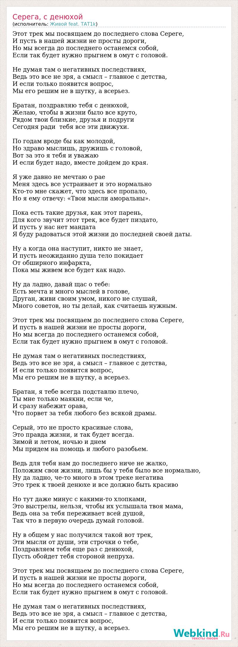 Этот трек мы посвящаем до последнего слова Сереге, И пусть в нашей жизни не просты дороги, Но мы всегда до последнего останемся собой, Если так будет нужно прыгнем в омут с головой. Не думая там о негативных последствиях, Ведь это все не зря, а смысл – главное с детства, И если только появится вопрос, Мы его решим не в шутку, а всерьез. Братан, поздравляю тебя с денюхой, Желаю, чтобы в жизни было все круто, Рядом твои близкие, друзья и подруги Сегодня ради тебя все эти движухи. По годам вроде бы как молодой, Но здраво мыслишь, дружишь с головой, Вот за это я тебя и уважаю И если будет надо, вместе дойдем до края. Я уже давно не мечтаю о рае Меня здесь все устраивает и это нормально Кто-то мне скажет, что здесь все пропало, Но я ему отвечу: «Твои мысли аморальны». Пока есть такие друзья, как этот парень, Для кого звучит этот трек, все будет пиздато, И пусть у нас нет мандата Я буду радоваться этой жизни до последней своей даты. Ну а когда она наступит, никто не знает, И пусть неожиданно душа тело покидает От обширного инфаркта, Пока мы живем все будет как надо. Ну да ладно, давай щас о тебе: Есть мечта и много мыслей в голове, Друган, живи своим умом, никого не слушай, Много советов, но ты делай, как считаешь нужным. Этот трек мы посвящаем до последнего слова Сереге, И пусть в нашей жизни не просты дороги, Но мы всегда до последнего останемся собой, Если так будет нужно прыгнем в омут с головой. Не думая там о негативных последствиях, Ведь это все не зря, а смысл – главное с детства, И если только появится вопрос, Мы его решим не в шутку, а всерьез. Братан, я тебе всегда подставлю плечо, Ты мне только маякни, если че, И сразу набежит орава, Что порвет за тебя любого без всякой драмы. Серый, это не просто красивые слова, Это правда жизни, и так будет всегда. Зимой и летом, ночью и днем Мы придем на помощь и любого разобьем. Ведь для тебя нам до последнего ниче не жалко, Положим свои жизни, лишь бы у тебя было все нормально, Ну да ладно, че-то много в этом треке негатива Это трек к твоей денюхе и все должно быть красиво Но тут даже минус с какими-то хлопками, Это выстрелы, нельзя, чтобы их услышала твоя мама, Ведь она за тебя переживает всей душой, Так что в первую очередь думай головой. Ну в общем у нас получился такой вот трек, Эти мысли от души, эти строчки о тебе, Поздравляем тебя еще раз с денюхой, Пусть обойдет тебя стороной непруха. Этот трек мы посвящаем до последнего слова Сереге, И пусть в нашей жизни не просты дороги, Но мы всегда до последнего останемся собой, Если так будет нужно прыгнем в омут с головой. Не думая там о негативных последствиях, Ведь это все не зря, а смысл – главное с детства, И если только появится вопрос, Мы его решим не в шутку, а всерьез.