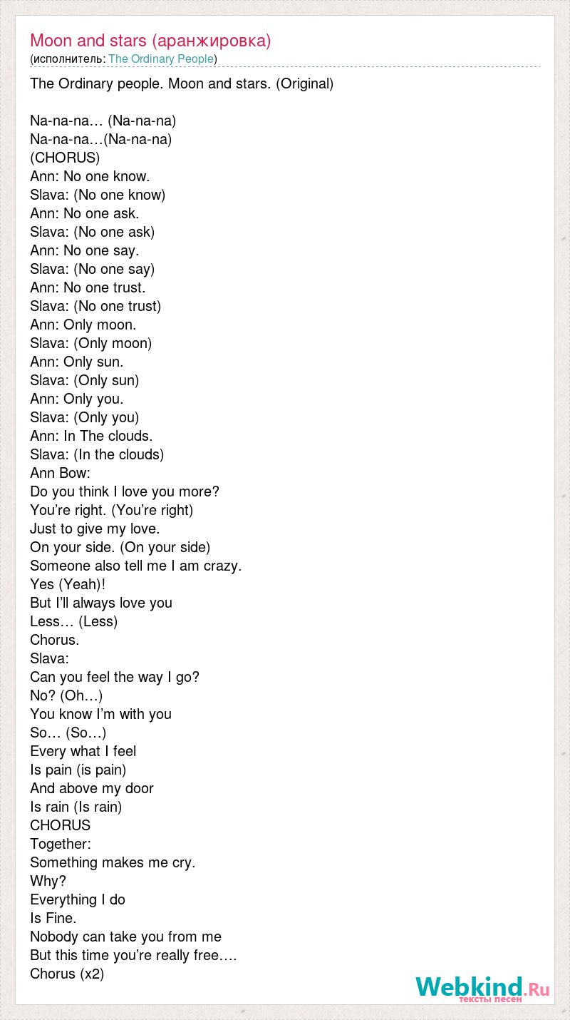 The Ordinary people. Moon and stars. (Original) Na-na-na… (Na-na-na) Na-na-na…(Na-na-na) (CHORUS) Ann: No one know. Slava: (No one know) Ann: No one ask. Slava: (No one ask) Ann: No one say. Slava: (No one say) Ann: No one trust. Slava: (No one trust) Ann: Only moon. Slava: (Only moon) Ann: Only sun. Slava: (Only sun) Ann: Only you. Slava: (Only you) Ann: In The clouds. Slava: (In the clouds) Ann Bow: Do you think I love you more? You’re right. (You’re right) Just to give my love. On your side. (On your side) Someone also tell me I am crazy. Yes (Yeah)! But I’ll always love you Less… (Less) Chorus. Slava: Can you feel the way I go? No? (Oh…) You know I’m with you So… (So…) Every what I feel Is pain (is pain) And above my door Is rain (Is rain) CHORUS Together: Something makes me cry. Why? Everything I do Is Fine. Nobody can take you from me But this time you’re really free…. Chorus (x2)