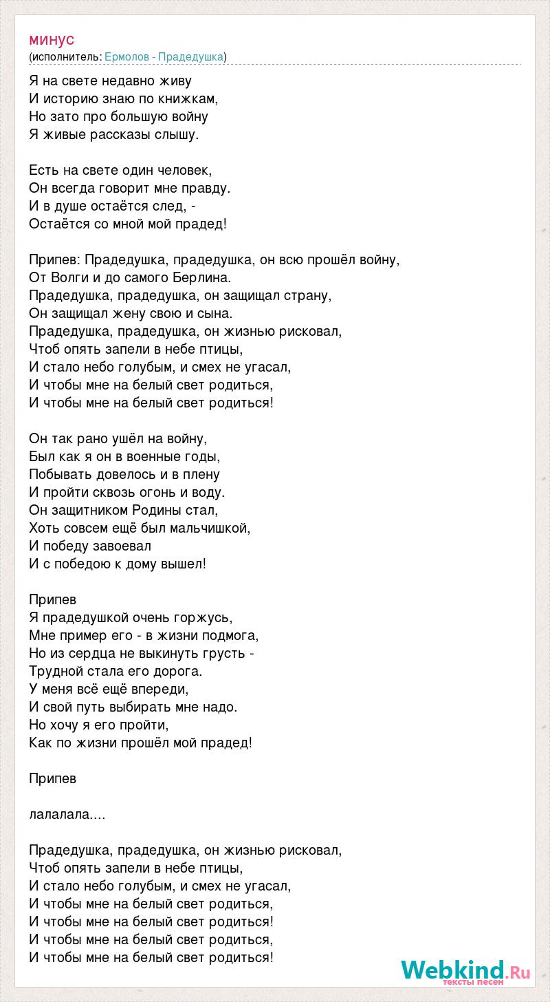 Я на свете недавно живу И историю знаю по книжкам, Но зато про большую войну Я живые рассказы слышу. Есть на свете один человек, Он всегда говорит мне правду. И в душе остаётся след, - Остаётся со мной мой прадед! Припев: Прадедушка, прадедушка, он всю прошёл войну, От Волги и до самого Берлина. Прадедушка, прадедушка, он защищал страну, Он защищал жену свою и сына. Прадедушка, прадедушка, он жизнью рисковал, Чтоб опять запели в небе птицы, И стало небо голубым, и смех не угасал, И чтобы мне на белый свет родиться, И чтобы мне на белый свет родиться! Он так рано ушёл на войну, Был как я он в военные годы, Побывать довелось и в плену И пройти сквозь огонь и воду. Он защитником Родины стал, Хоть совсем ещё был мальчишкой, И победу завоевал И с победою к дому вышел! Припев Я прадедушкой очень горжусь, Мне пример его - в жизни подмога, Но из сердца не выкинуть грусть - Трудной стала его дорога. У меня всё ещё впереди, И свой путь выбирать мне надо. Но хочу я его пройти, Как по жизни прошёл мой прадед! Припев лалалала.... Прадедушка, прадедушка, он жизнью рисковал, Чтоб опять запели в небе птицы, И стало небо голубым, и смех не угасал, И чтобы мне на белый свет родиться, И чтобы мне на белый свет родиться! И чтобы мне на белый свет родиться, И чтобы мне на белый свет родиться!