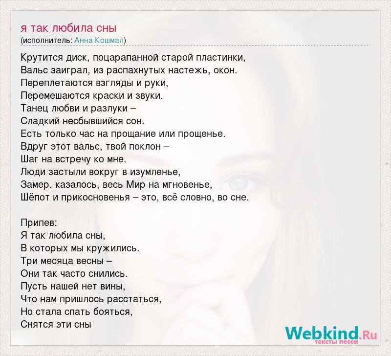Крутится диск, поцарапанной старой пластинки, Вальс заиграл, из распахнутых настежь, окон. Переплетаются взгляды и руки, Перемешаются краски и звуки. Танец любви и разлуки – Сладкий несбывшийся сон. Есть только час на прощание или прощенье. Вдруг этот вальс, твой поклон – Шаг на встречу ко мне. Люди застыли вокруг в изумленье, Замер, казалось, весь Мир на мгновенье, Шёпот и прикосновенья – это, всё словно, во сне. Припев: Я так любила сны, В которых мы кружились. Три месяца весны – Они так часто снились. Пусть нашей нет вины, Что нам пришлось расстаться, Но стала спать бояться, Снятся эти сны