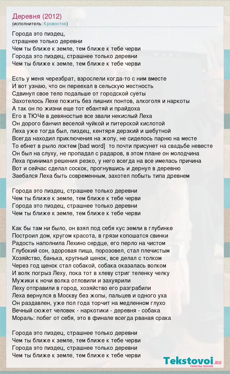 Города это пиздец, страшнее только деревни Чем ты ближе к земле, тем ближе к тебе черви Города это пиздец, страшнее только деревни Чем ты ближе к земле, тем ближе к тебе черви Есть у меня черезбрат, взрослели когда-то с ним вместе И вот узнаю, что он переехал в сельскую местность Сдвинул свое тело подальше от городской суеты Захотелось Лехе пожить без лишних понтов, алкоголя и наркоты А так он по жизни еще тот ебантяй и прайдоха Его в ТЮЧе в девяностые все звали некислый Леха Он дорого банчил веселой чуйкой и питерской кислотой Леха уже тогда был, пиздец, кентяря дерзкий и шебутной Всегда находил приключения на жопу, не сиделось парню на месте То ебнет в рыло локтем [bad word] то почти присунет на свадьбе невесте Он был на слуху, не пропадал с радаров, в этом плане он молодчина Леха принимал решения резко, у него всегда на все имелась причина Вот и сейчас сделал соскок, прогнувшись и дернул в деревню Заебался Леха быть современным, захотел побыть типа древнем Города это пиздец, страшнее только деревни Чем ты ближе к земле, тем ближе к тебе черви Города это пиздец, страшнее только деревни Чем ты ближе к земле, тем ближе к тебе черви Как бы там ни было, он взял под себя кус земли в глубинке Построил дом, кругом красота, в грязи копошатся свинки Радость наполнила Лехино сердце, его перло на чистом Глубокий сон, здоровая пища, порозовел, стал плечистым Хозяйство, банька, крупный щенок, все делал с толком Через год щенок стал собакой, собака оказалась волком И волк погрыз Леху, пока тот в хлеву стриг теленку челку Мужики к ночи волка отловили и захуярили Леху отправили в город, хозяйство его разграбили Леха вернулся в Москву без жопы, пальцев и одного уха Он раздавлен, уже пол года торчит на медленном глухо Вечный сюжет человек - наркотики - деревня - собака Мораль: побег от себя, это в финале всегда рваная срака Города это пиздец, страшнее только деревни Чем ты ближе к земле, тем ближе к тебе черви Города это пиздец, страшнее только деревни Чем ты ближе к земле, тем ближе к тебе черви