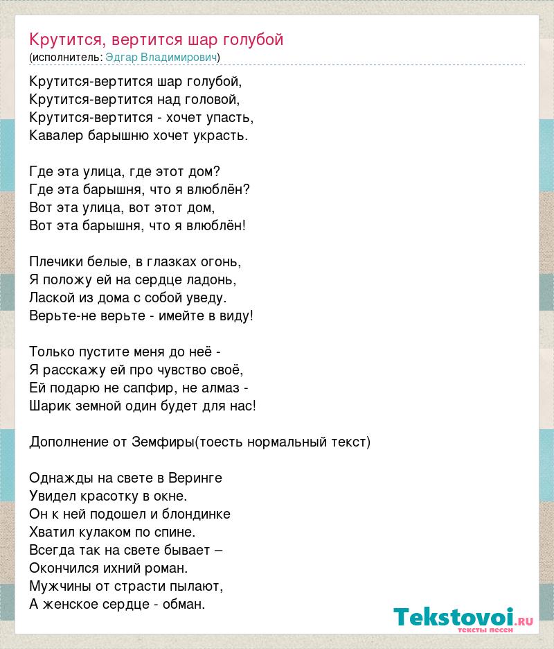 Крутится-вертится шар голубой, Крутится-вертится над головой, Крутится-вертится - хочет упасть, Кавалер барышню хочет украсть. Где эта улица, где этот дом? Где эта барышня, что я влюблён? Вот эта улица, вот этот дом, Вот эта барышня, что я влюблён! Плечики белые, в глазках огонь, Я положу ей на сердце ладонь, Лаской из дома с собой уведу. Верьте-не верьте - имейте в виду! Только пустите меня до неё - Я расскажу ей про чувство своё, Ей подарю не сапфир, не алмаз - Шарик земной один будет для нас! Дополнение от Земфиры(тоесть нормальный текст) Однажды на свете в Веринге Увидел красотку в окне. Он к ней подошел и блондинке Хватил кулаком по спине. Всегда так на свете бывает – Окончился ихний роман. Мужчины от страсти пылают, А женское сердце - обман.