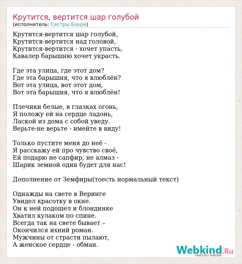 Крутится-вертится шар голубой, Крутится-вертится над головой, Крутится-вертится - хочет упасть, Кавалер барышню хочет украсть. Где эта улица, где этот дом? Где эта барышня, что я влюблён? Вот эта улица, вот этот дом, Вот эта барышня, что я влюблён! Плечики белые, в глазках огонь, Я положу ей на сердце ладонь, Лаской из дома с собой уведу. Верьте-не верьте - имейте в виду! Только пустите меня до неё - Я расскажу ей про чувство своё, Ей подарю не сапфир, не алмаз - Шарик земной один будет для нас! Дополнение от Земфиры(тоесть нормальный текст) Однажды на свете в Веринге Увидел красотку в окне. Он к ней подошел и блондинке Хватил кулаком по спине. Всегда так на свете бывает – Окончился ихний роман. Мужчины от страсти пылают, А женское сердце - обман.